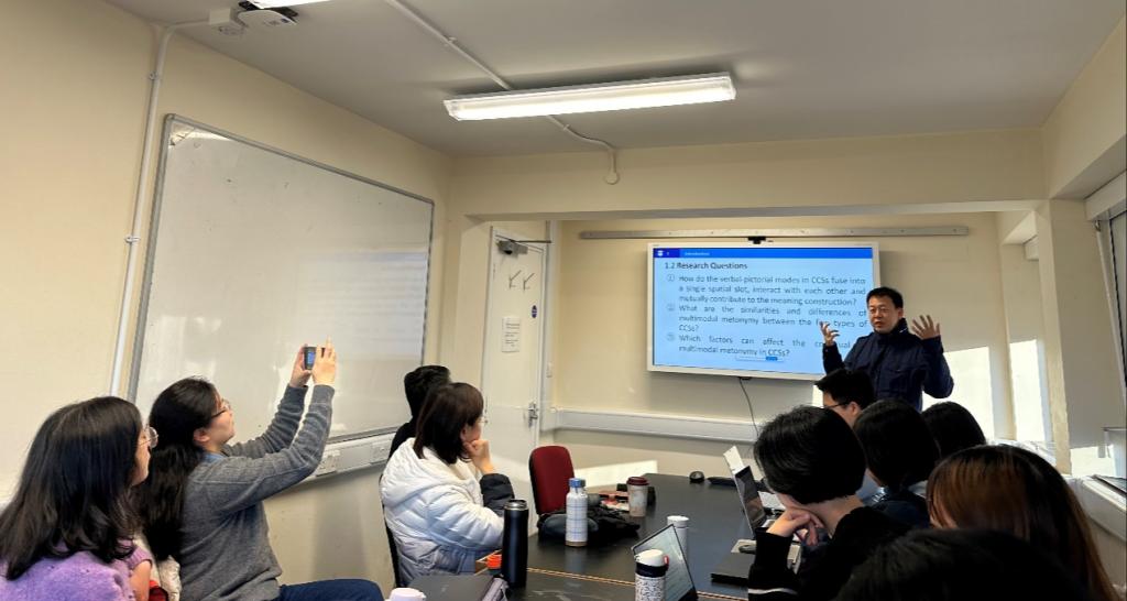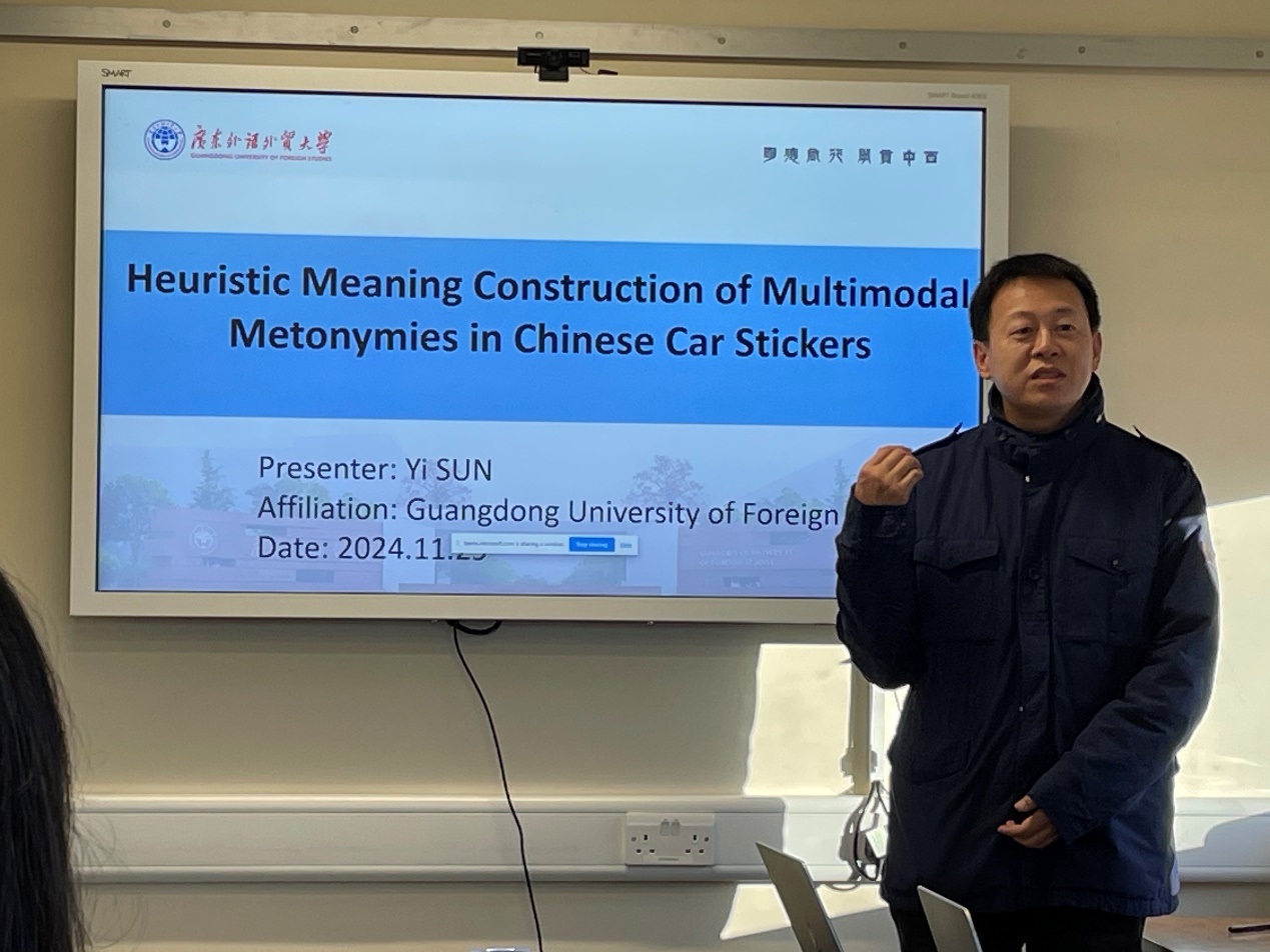 本网讯 当地时间11月29日下午,《伟德bv国际体育,BETVICTOR官网学报》主编、云山杰出学者孙毅教授在剑桥大学举办了一场题为《中文车贴多模态转喻的整体意义构建(Heuristic Meaning Construction of Multimodal Metonymies in Chinese Car Stickers)》的英文讲座。此次讲座采用线上线下同步的方式进行,吸引了数百名国内外学者参与。