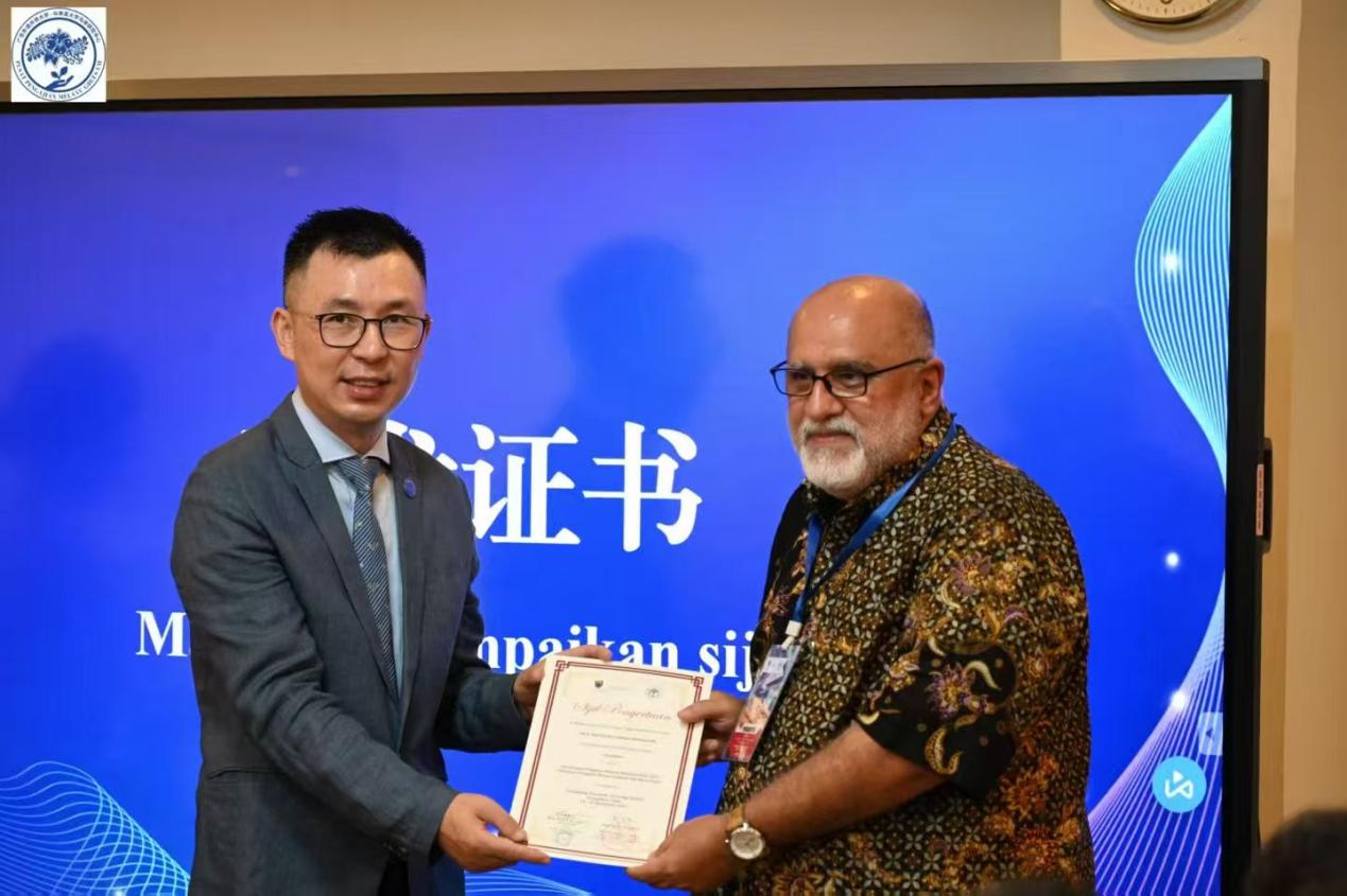 刘志强与萨布扎里代表两校签署了广外-马来亚大学马来研究中心共建协议,并为该中心揭牌。双方代表共同佩戴上中心徽章,并互赠纪念品。