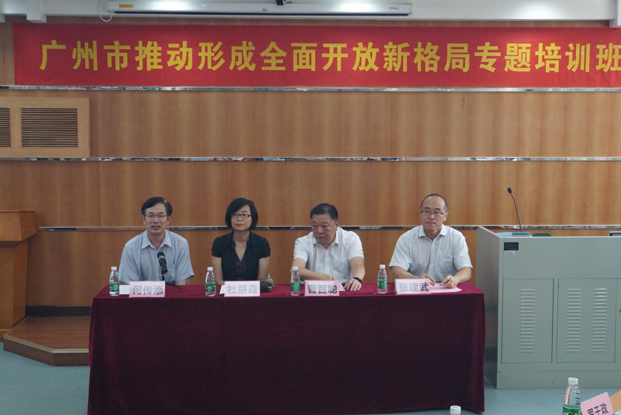 本网讯 6月11日,广州市推动形成全面开放新格局专题培训班在伟德bv国际体育北校丝纺讲堂举行开班仪式,培训班旨在学习贯彻习近平新时代中国特色社会主义思想和党的十九大精神,推动广州作为国家重要中心城市的建设水平,建成向世界展示践行习近平新时代中国特色社会主义思想的重要“窗口”和“示范区”。广州市市委组织部副部长杜丽霞、市商务委党组成员、巡视员曹智聪,伟德bv国际体育副校长何传添出席仪式。