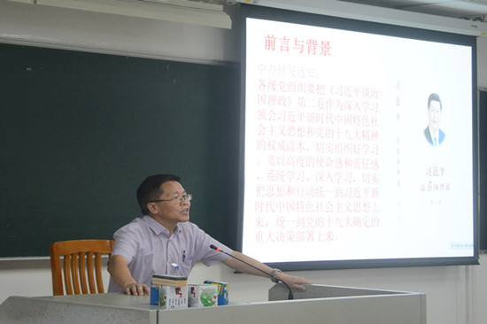 谢迪斌强调了深入系统学习习近平新时代中国特色社会主义思想和党的十九大精神的必要性、重要性和迫切性。他从基本概况、主要内容和学习方法等三个方面,向会计学院师生深入浅出地阐述了《习近平谈治国理政》(第二卷)的主要内容和学习著作的具体方法。他提出教职工和同学们都要“学通学懂”“学好用好”这部重要著作,不断深入领会习近平新时代中国特色社会主义思想的时代背景、科学体系、精神实质和实践要求,不断深入领会这一思想的重大政治意义、理论意义和实践意义。
