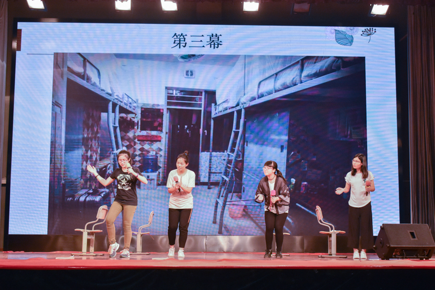 展示大会通过舍友之间情感发展的主线,以“相遇、相伴、相知、相惜”四个篇章展示了宿舍生活的点点滴滴和舍友间的温馨情感。舍友初识,英教学院6-209的“婉约苑”以情景剧再现了这一懵懂相识场景;舍友相伴,妙趣横生,英文学院12-406“Happy鸡腿堡”以风趣搞怪的视频配音展示了舍友之间在广外的学习和生活趣事;舍友相知,经贸学院8-325的学生白衣飘飘,深情朗诵了宿舍4人的感人暖心经历;舍友相惜,艺术学院3-734“瀛海林意”的舞蹈举手投足间传达出了她们的默契。精彩的表演中,十佳宿舍还各自展示了她们的《宿舍公约》,有秉承“好好学习天天向上”宗旨的学习类,有要求早睡和运动的健康生活类,还有目标明确共同奋斗的梦想类等等。