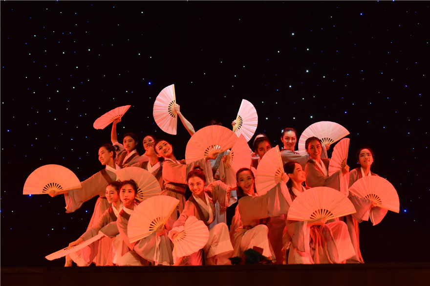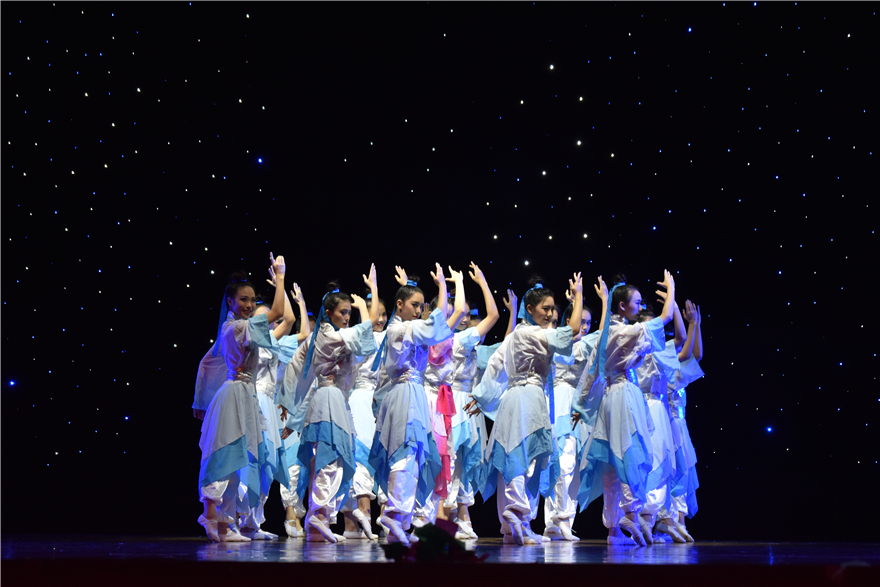 一曲《落花》响起,经济贸易学院的《落花》一舞亦缓缓展开。“花开的时候最珍贵,花落了就枯萎”,本应是感叹花之凋落亦如人之生死的无常感叹。但这群身穿粉白衣裙、如花般的女孩子,用干脆有力的动作和充满感染力的甜美笑容,表现生命的美好和坚强,传达哀而不伤的东方哲学。花落又如何,还未终止,便在一颦一笑、一举手一投足间将美绽放到极致。古乐的三两弹拨声里,也有一群姿态袅娜但背对观众的姑娘。她们娉婷一转身,水袖轻划过空气,微微低头里是江南女子的含蓄美。这是来自信息科学与技术学院的《越女吟》。她们或翩若惊鸿,或婉若游龙,动作优雅而流畅。她们还排成一列,逐次探出身来,将手抬高使水袖自然垂下,微微侧头,巧笑嫣然。尾声处,她们使用了古代女子的跪拜礼,有无尽的雅致韵味。