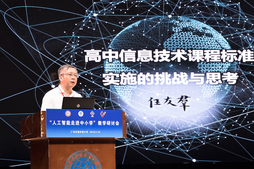 华东师范大学教授、教育部高中信息技术课程标准修订组组长任友群作课标解读,题为“高中信息技术课程标准实施的挑战与思考”,介绍了普通高中信息技术新课程标准修订的背景,标准研制的过程和主要变化,包括信息技术学科核心素养,课程内容与学分设置等,并分享基于新课程标准的教学与评价需要做的准备,与参会者共同探讨随着课程标准的实施即将面对的挑战与问题。