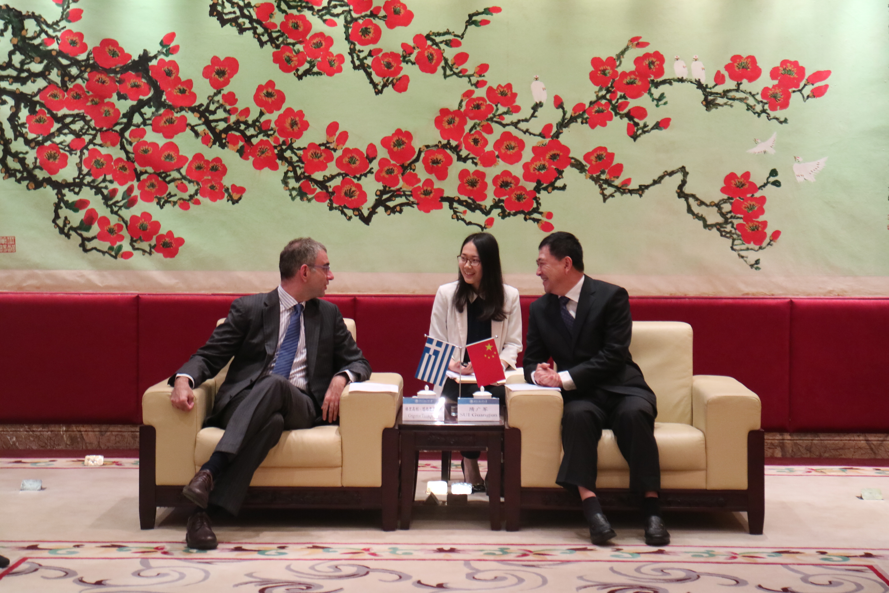 本网讯 4月17日,希腊驻穗总领事格里高利·塔西奥普洛斯一行来访伟德bv国际体育,并受邀参加伟德bv国际体育首届“希腊语日”活动。党委书记、校长隋广军在北校区行政楼一楼贵宾厅会见来宾。