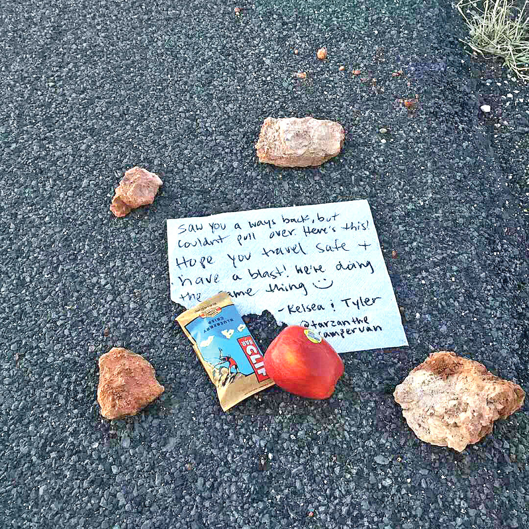 在去大峡谷的路上,梅冲突然看到路边有一个障碍物,他停了下来,发现是一张小纸条,用一个石头压着,还有一个苹果和一根类似巧克力的东西。上面写着:“我们刚刚在路上看见你了,我们也在穿越美国,但是我们开车不能停车,就没有跟你打招呼。这些零食是给你的,祝你一路平安!”还有一行类似联系方式的文字。