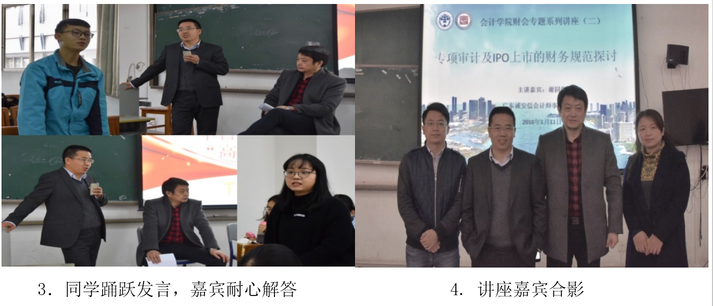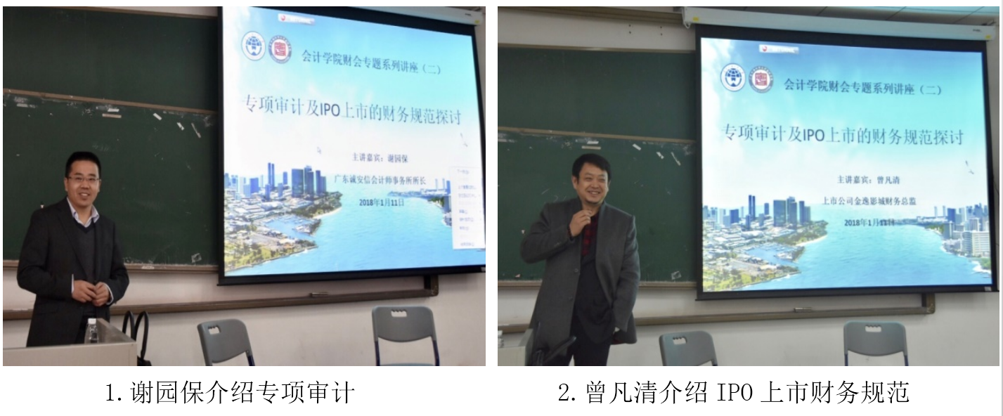 1月11日上午,会计学院实践教学周第五场财会专题讲座“专项审计及IPO上市的财务规范”在教学楼C208教室举行。学院邀请到广东诚安信会计师事务所所长主管合伙人谢园保先生介绍专项审计业务,以及上市公司金逸影城财务总监曾凡清先生介绍企业IPO上市的财务规范。会计学院教师刘慧芬主持本次讲座。