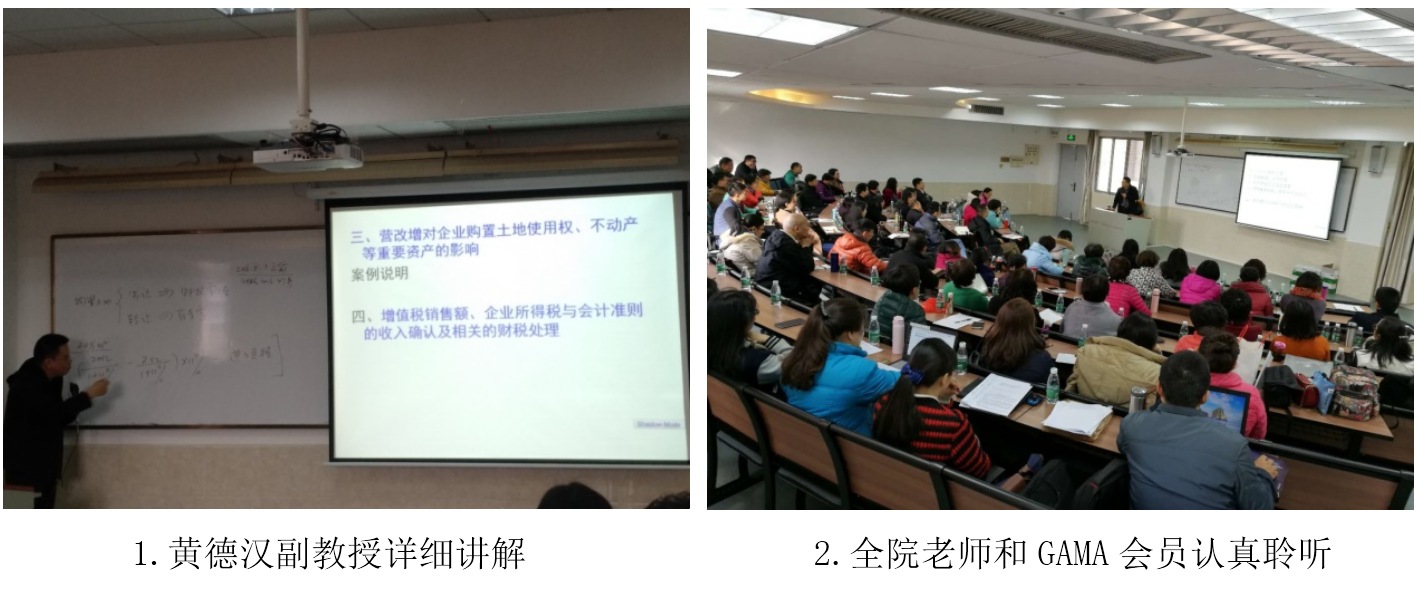讲座分为上午和下午两场,黄德汉向本学院老师们及各位GAMA会员说明了营改增的重要目的,利用众多实务案例系统地解析了营改增相关的各种条例和文件,详细地阐述了营改增对财税处理的影响。持续四个小时的营改增财税讲座专题包括以下内容:为什么要营改增;营改增对企业税负的实际影响;营改增对企业购置土地使用权、不动产等重要资产的影响;增值税的销售额、企业所得税与会计准则的收入确认及相关的财税处理;增值税与企业所得税视同销售的区别与相关的财税处理;增值税进项税额应关注的相关问题;兼营销售与混合销售的财税处理。