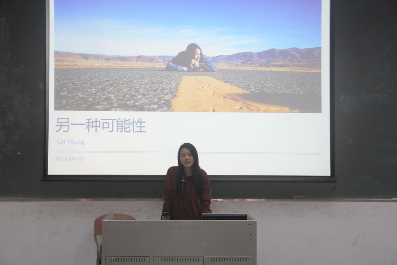 讲座开头,杨清敏用她在重游川藏时趴在318国道上拍的一张照片吸引了同学们的注意,她说:“之所以选择这张照片,是因为它有辽阔的感觉,给人充满可能性的感觉。” 杨清敏通过介绍自己的游历经历引出讲座的主题,她认为,我们不必活在社会的标准中,反而可以创造和寻找另一种人生的可能性。引出并阐述主题后,杨清敏从她的生活、工作以及学习几个方面来与我们分享她的经验。