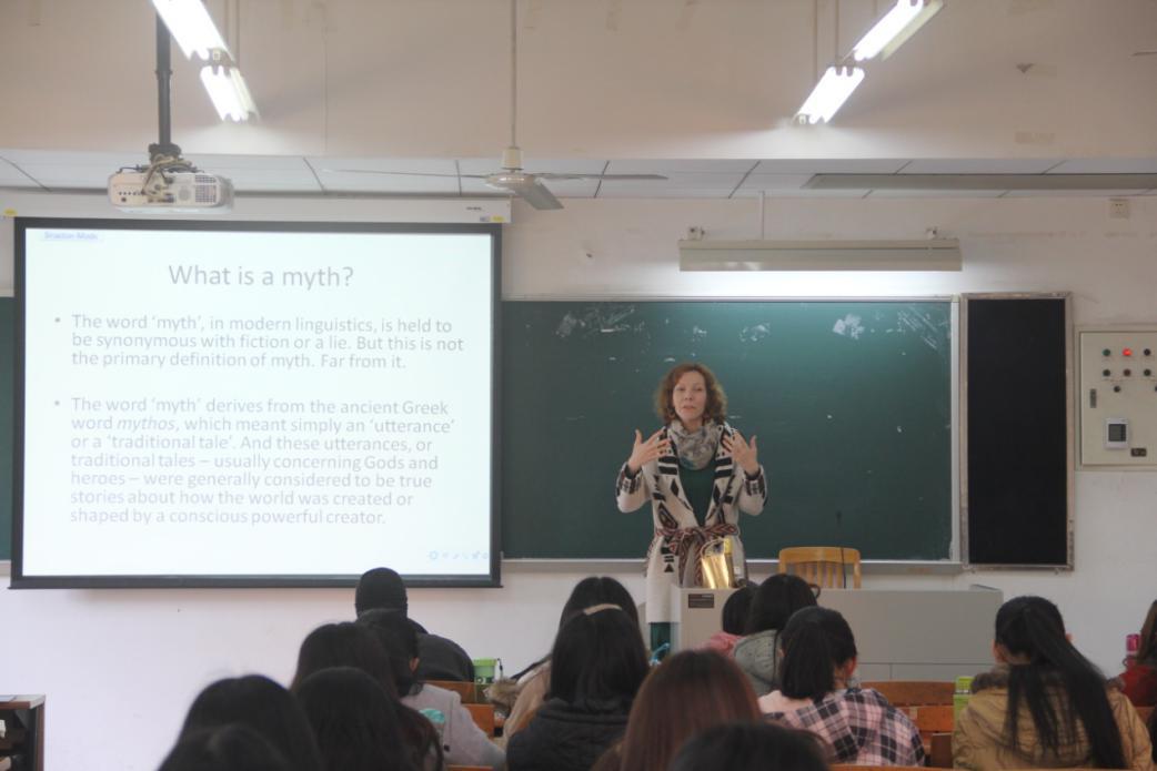 Bilijana老师介绍了斯拉夫民族的起源、地理分布和当前的国家信息。然后,她简要地介绍了古代斯拉夫神话的主要功能,通过讲述神话在地理位置上从喀尔巴锡山脉延伸到南欧,在民歌、诗歌和寓言中的反映,在两名马其顿作家的当代小说中被重新诠释,让同学了解到神话和文学的不同点。Bilijana着重介绍了现代文学中的神话元素的复兴。她以经典小说《百年孤独》为例,作者马尔克斯描写了一个马其顿村庄和一个虚构的世界的循环,就像他持续力一百年的孤独。她还提到了一本名为《龙的新娘》的小说,讲述了在我们的民间传说中,所有的幻想生物其实都是在当代世界生存着的。