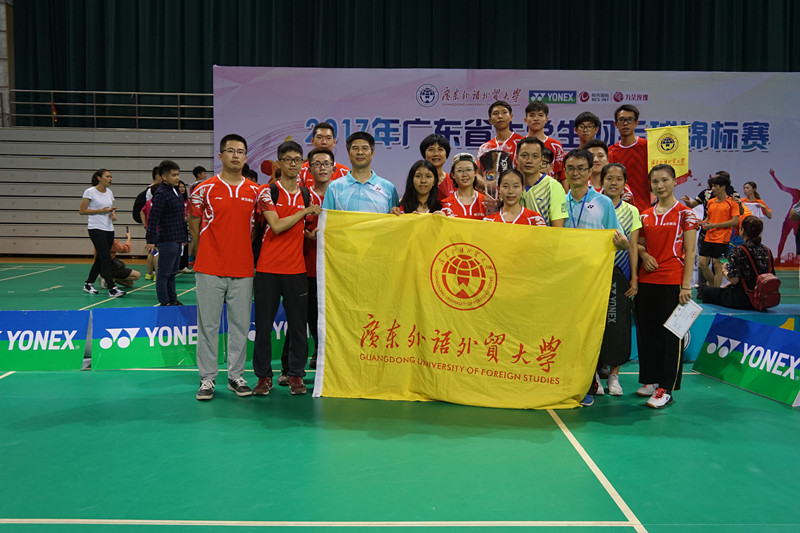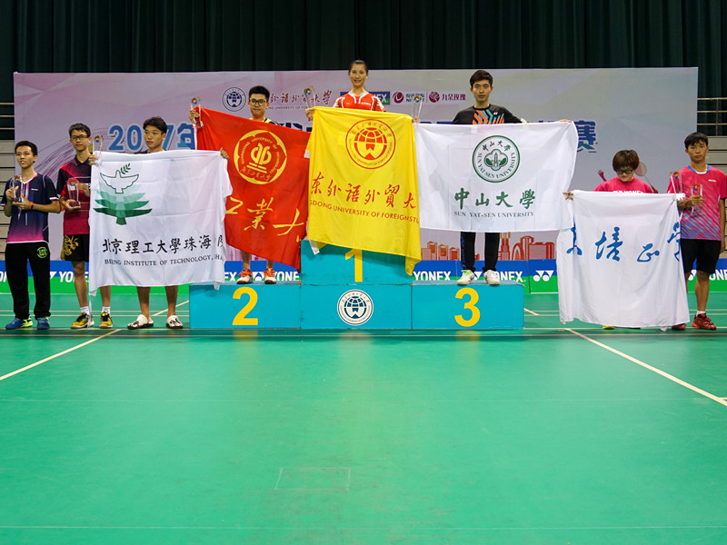 本网讯 11月9日至12日,2017年广东省大学生羽毛球锦标赛在伟德bv国际体育南校区体育馆进行。伟德bv国际体育代表队主场作战取得获历史性突破,获得女单冠军、男单第三、女双第四,甲组团体第一的优异成绩。12日下午,广东省教育厅体卫艺处副处长侯波、广东省学生体育艺术联合会秘书长林子平、国际裁判兼本次比赛裁判长李森,伟德bv国际体育体育部主任林少娜、体育部党总支书记李旭武的出席颁奖仪式。