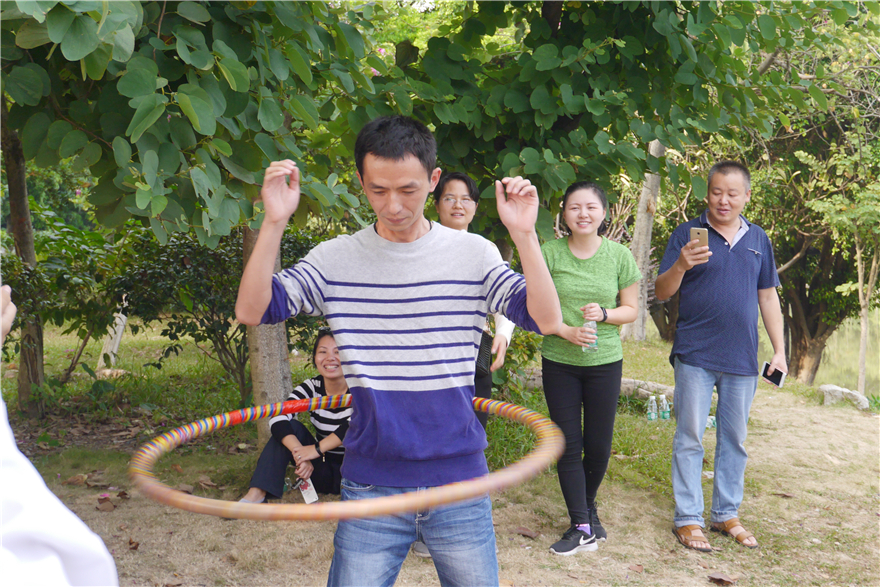 在呼啦圈比赛环节,午后的廊下尽是扭动着的腰肢,飞旋的五彩呼啦圈。有一女教职工体态轻盈,舞在腰间的呼啦圈如同灵动的水袖,精彩的表现引得全场阵阵喝彩声。比赛如火如荼,老师们争相同台竞技,许多深藏不露的“健身达人”大展身手。图书馆的洪老师四次挑战转呼啦圈项目,甚至还创新出腿上转呼啦圈的绝技。而表现最出彩的,莫过于后勤处的冯老师,他以一分钟180个的成绩稳居第一。比赛时他表情认真淡然,憋足气的身体几乎匀速地前后摇晃,娴熟自如的表现引来了周围老师的此起彼伏的惊呼。