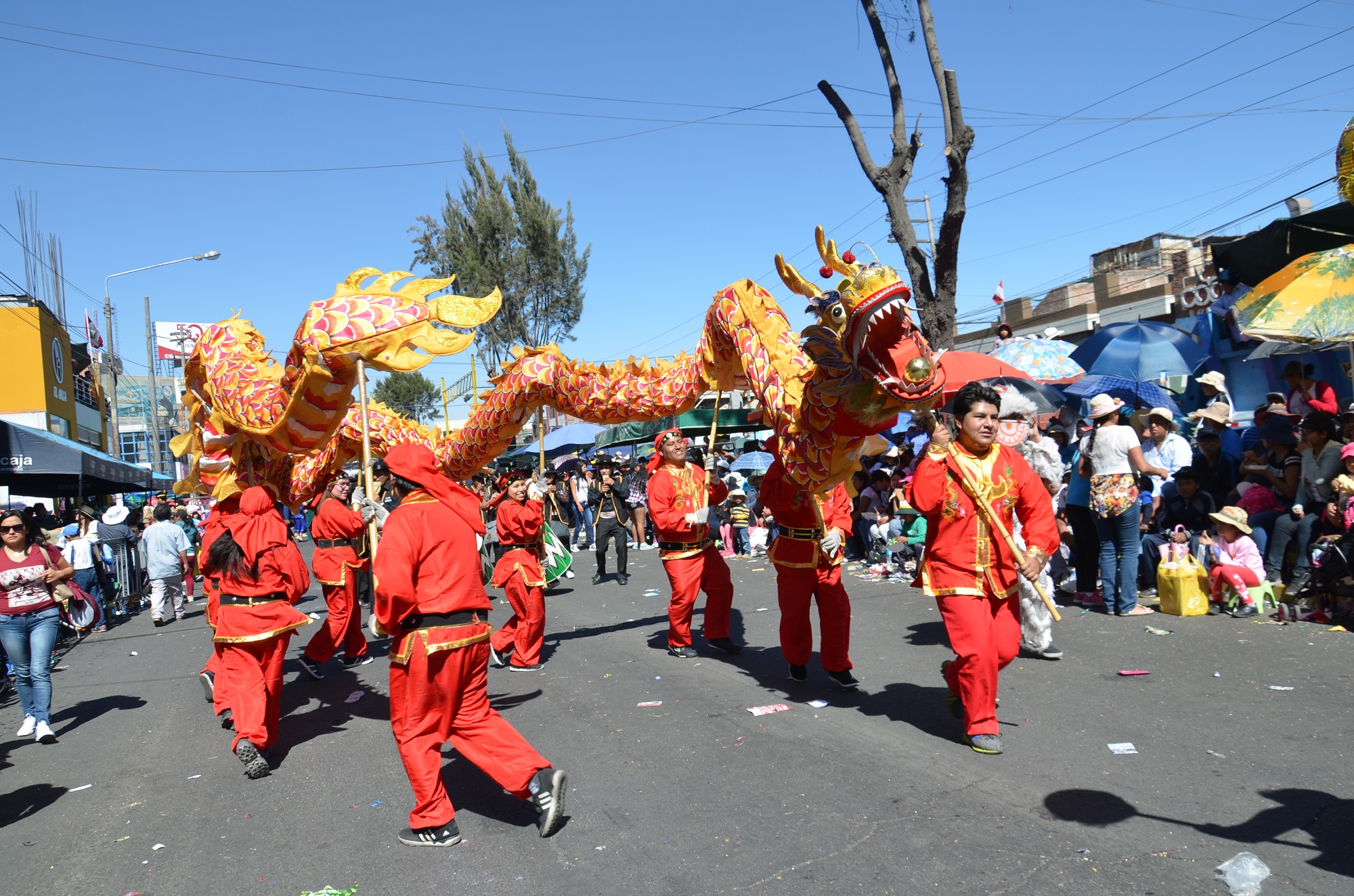 本网讯 8月15日,为庆祝建城477周年,秘鲁南部城市阿雷基帕市举行一年一度盛大的花车巡游。成百上千辆花车沿着主要街道巡游,人们载歌载舞,整座城市热闹非凡,沉浸在一片狂欢的海洋中。秘鲁圣玛丽亚天主教大学孔子学院大型“金鸡”花车,舞龙、舞狮、中国古典舞蹈、太极功夫扇、中华民族服装秀等表演成为节日亮点,赢得数万观众的喝彩。