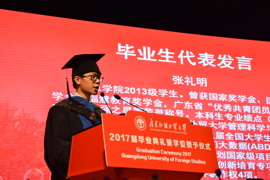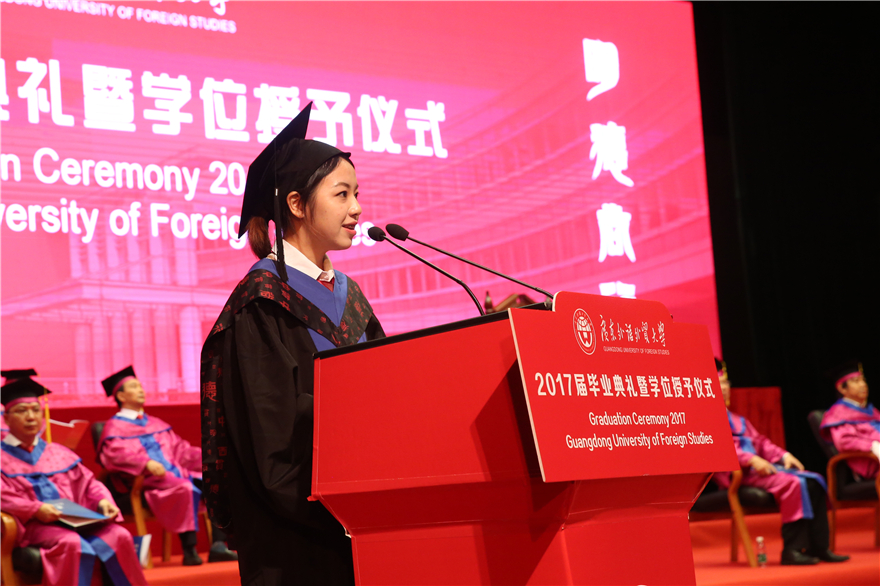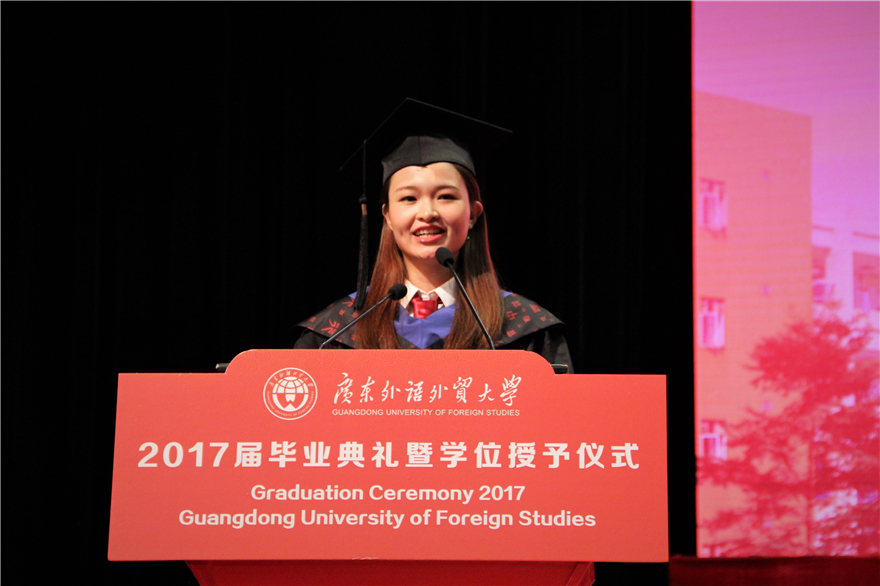 而如今,即将离开校园的我们都有一个共同的名字和烙印——“广外人”。很庆幸我们适逢一个开放的时代,而国际化是广外最鲜明的特色和极具竞争力的优势。无论是“一带一路”,还是走向海外的中国高铁,在这些开放潮流中,作为“广外人”的我们,时刻保有开放的思维和一颗年轻的心,相信在这大时代里面我们能够发挥自我能力,实现自我价值,用心讲好“广外故事”,讲好“中国故事”。