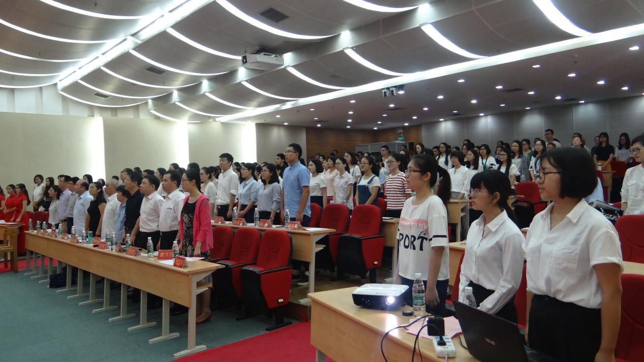 本网讯 6月8日下午,翻译学院举行“七一”表彰大会暨入党宣誓仪式。面对鲜红的党旗,28名预备党员在教师党员、学生入党介绍人的带领下庄严宣誓,一批先进基层党组织和优秀个人得到表彰。校关心下一代工作委员会主任冯益谦、校党建组织员李海丽和翻译学院教工党员、学生党员、入党积极分子参加活动。翻译学院党委书记刘志军主持仪式。