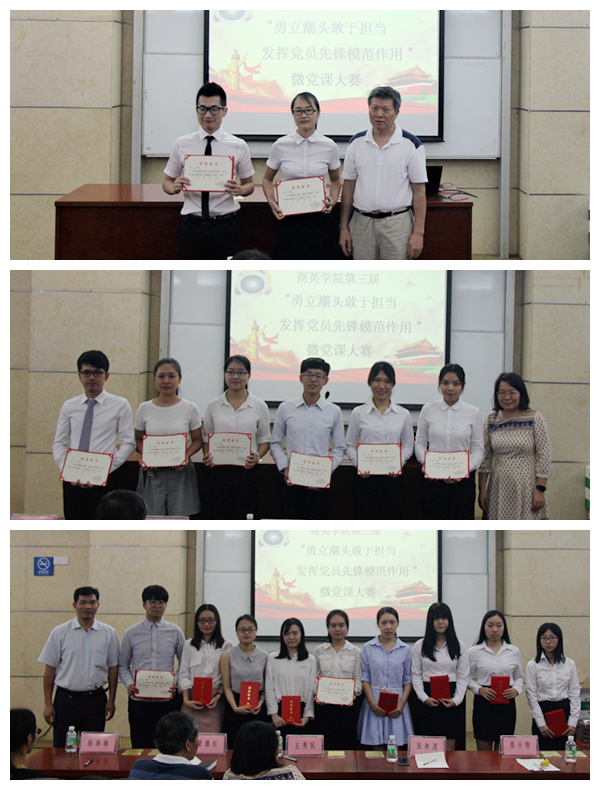 本网讯 为持续推进“两学一做”学习教育常态化制度化,6月9日晚,商英学院举办了第三届“勇立潮头敢于担当,发挥党员先锋模范作用”微党课大赛,各学生党支部共六组队伍参赛。校特聘组织员蒙德红、学院党委书记王秀民等作为评委嘉宾出席本次比赛。