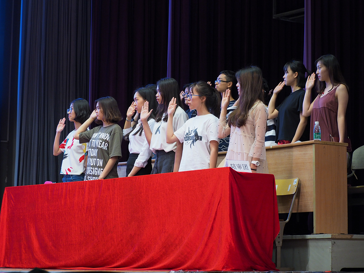陪审团是英美法系法庭中的重要角色。本次模拟法庭的“陪审团”由部分观众组成,让观众参与到“法庭”中,感受“法庭”的正义威严。“法官”到庭,并要求核对控辩双方身份。其后“陪审团”就座,进行庭前宣誓。