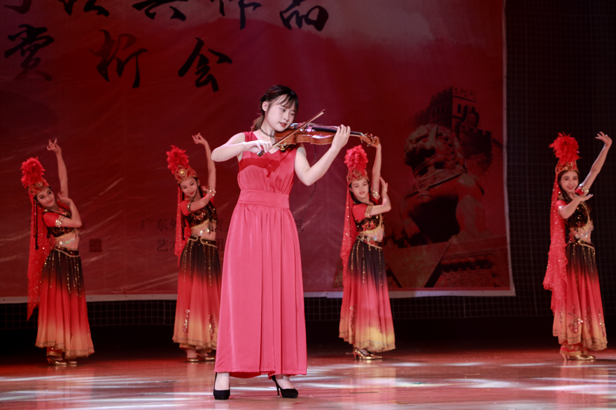 不同以上两首纯乐曲演奏曲目,艺术学院师生在演绎电影《冰山上的来客》的主题曲《花儿为什么这样红》时,运用舞蹈与乐曲演奏相融合的形式,让观众们回到了迷茫与艰苦交织,渴望及向往爱情的知青们只能寄情于歌的年代。歌曲后半部分节奏轻快,身穿维吾尔族民族服装的舞蹈演员和着轻快欢愉的音乐旋转、跃动,表现知青们激情燃烧的青春岁月。