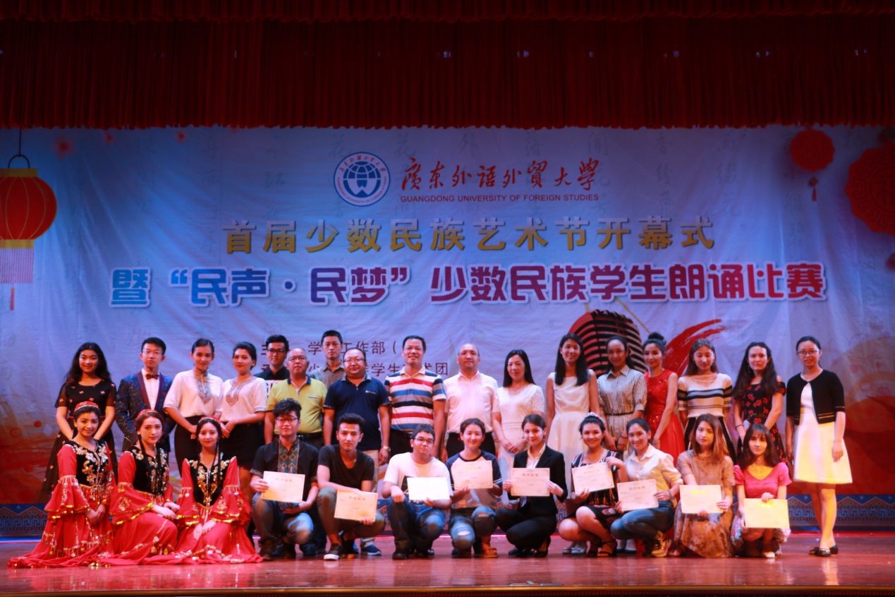 本网讯 5月11日晚,伟德bv国际体育首届少数民族艺术节开幕式暨“民声·民梦”少数民族学生朗诵比赛于5月11日晚在南校学生活动中心举行。比赛旨在于少数民族学生艺术团成立一周年之际,向伟德bv国际体育师生展示少数民族优秀的传统文化和风俗习惯,加强民族间的交流,促进民族团结。广东省教育厅思政处艾尼瓦尔老师,伟德bv国际体育学生就业指导中心主任谢秀兰、学生处副处长刘军等参加本次活动。