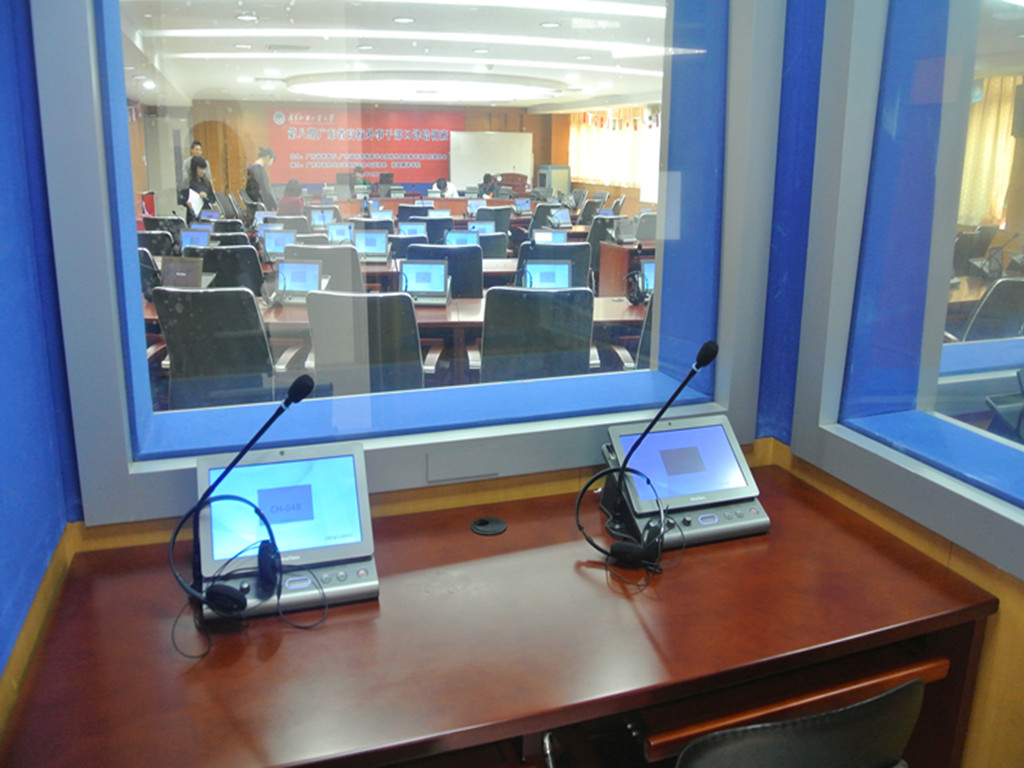同声传译会议实验室基础设施完备。其设有发言台、圆桌嘉宾区和一般来宾区,并设有4间固定译员间,共69座,每个座位均配有终端译员机。PPT、音视频等教学课件可以广播至每个终端显示和观看,嘉宾可以自由发言和讨论。人员进行同传实训时,可以根据需要进行单或双声道的录音;可以自主选择源音和译音的收听;并可方便的回放录音,进行点评。为提高专业化实验室利用率和设备使用率,实验室配合大学关于深化实验教学改革和提倡自主学习模式的教学部署,联合MTI和高翻学院为师生定制大量自主学习开放时间,使得实验室充分发挥了其实训特色以扩大受惠人群。