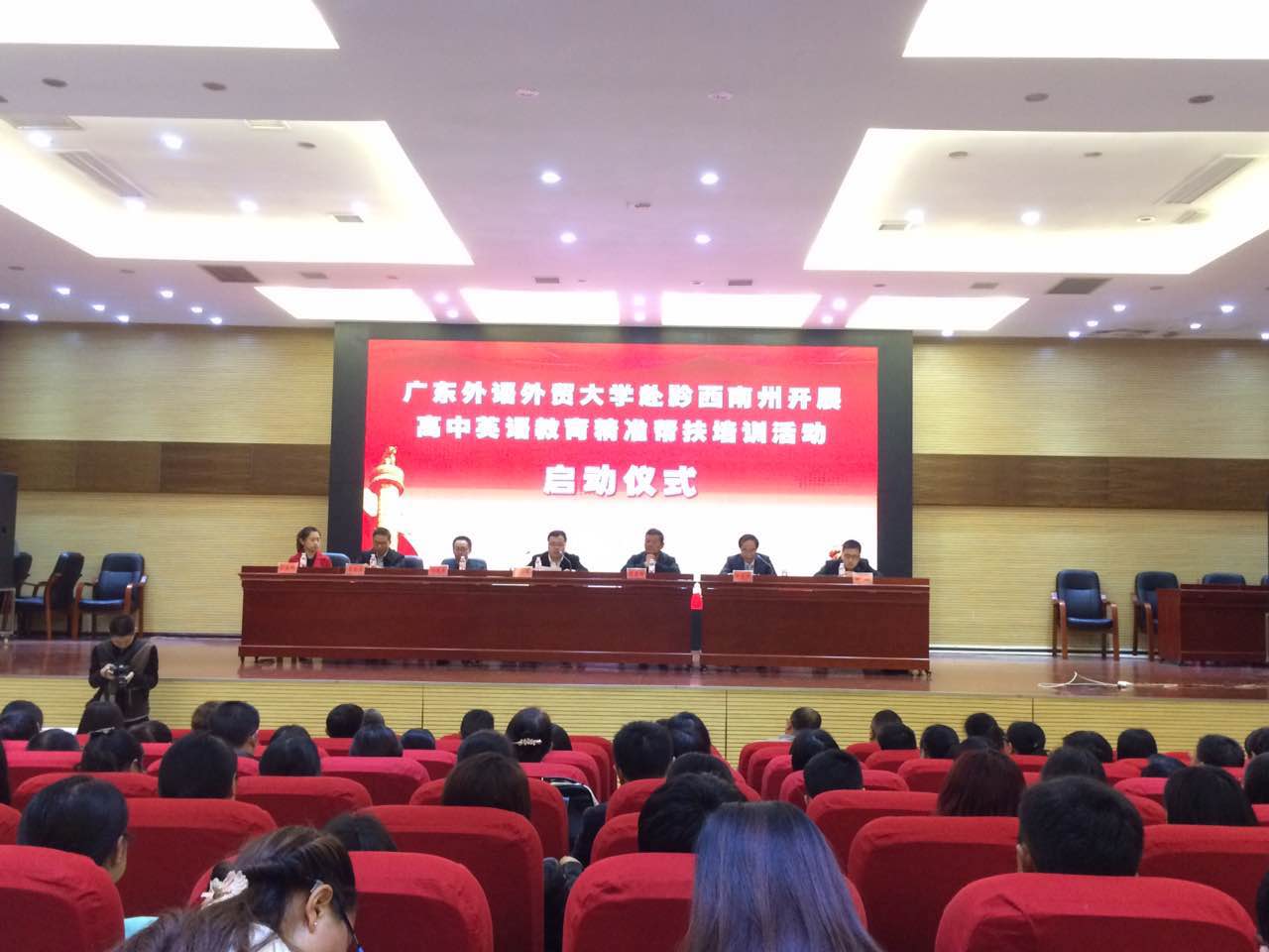 本网讯 4月25日,贵州省黔西南州开展高中英语教育精准帮扶活动启动仪式及英语教育培训在兴义一中多功能报告厅举行,黔西南州教育局局长梁喜明、副局长刘玉川,伟德bv国际体育教师发展中心、英语语言文化学院、附设外校高中英语教研组等相关负责人,以及来自黔西南州辖区内七县一市的100余名高中英语教学骨干参加了活动。