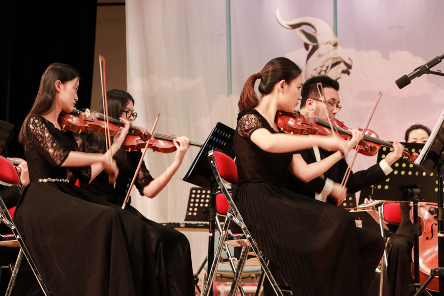 除了歌颂红色经典,本次音乐会还添入了不少西洋元素,让整场演出更为丰富多样。校管弦乐团的一首《轻骑兵序曲》拉开了西洋乐章的序幕,伴随着号角声和欢快的马蹄声,舞台上仿佛出现了一支轻骑兵在徐徐前进,营造了轻捷明快的气氛。随后,小提琴的演奏则奏出了匈牙利吉普赛雕饰调式的主题,表现了歌剧中骑兵队长回忆往事时百感交集的心情。
