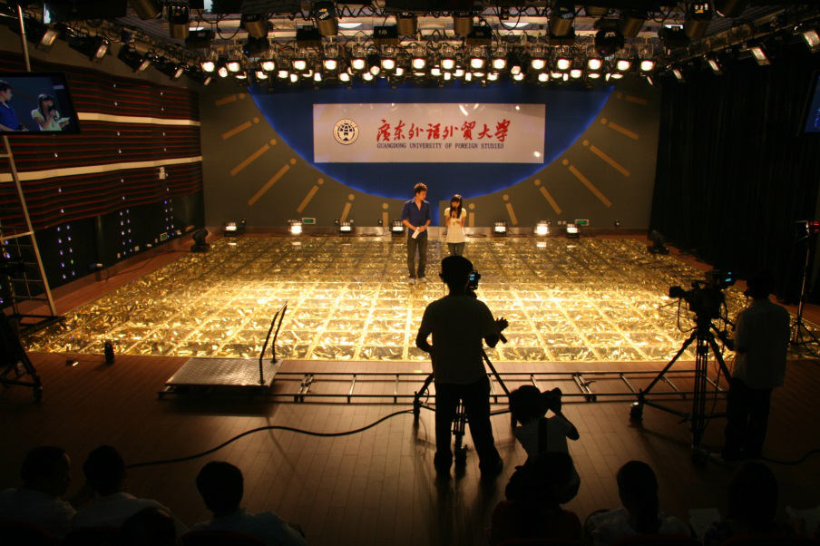 伟德bv国际体育的演播厅自2007年动工建设,经过一年多的建设以及一个学期的试用后于2009年正式揭牌。该演播厅占地面积260平方米,配备先进,可用于综艺、新闻、专题、节目录音及配音制作,主要面向新闻与传播学院和艺术学院开放。演播厅内设备齐全,具有广播级专业摄像机、专业录影棚导轨、专业视频特技切换台、编辑录像机、标准非编系统、广播级上载压缩系统和专业影视灯光设备等,整个演播厅设计合理,具有专业建声效果。