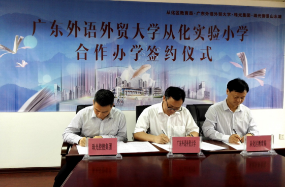本网讯 4月20日下午,伟德bv国际体育与从化区教育局、珠光控股集团签订三方合作办学协议,标志着广外基础教育合作办学首个公办学校——广外从化实验小学正式落户从化。伟德bv国际体育副校长刘建达,从化区委常委、常务副区长吴林波,从化区政府办公室副主任薛庆波,从化区教育局局长罗树人、副局长钟汉文,珠光控股集团总裁刘捷、副总裁曾加勤、市场经营管理中心总经理利瑛,伟德bv国际体育教育集团总经理孙建军、附设外语学校校长万清华等出席签约仪式。