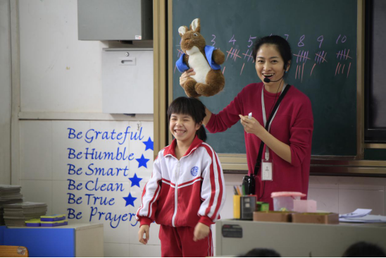 在小一(3)班的课堂上,跟妈妈一起参加开放日的小女孩靓靓,跟随老师的指挥,摇头晃脑唱起了英文歌。靓靓妈妈对女儿的表现很满意,笑着表示,女儿今年幼升小,性格活泼机灵,所以想来广外外校试试,“以前听传闻说广外外校特别难进,现在看来,一年级的基础不用担心,女儿完全跟得上”。