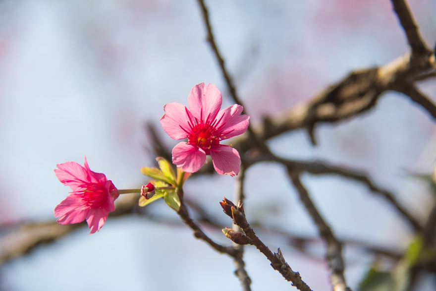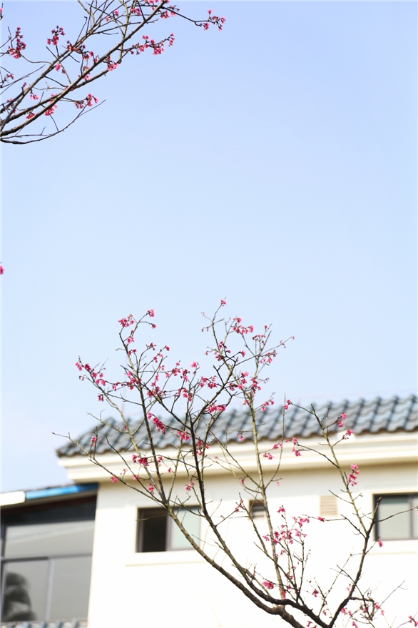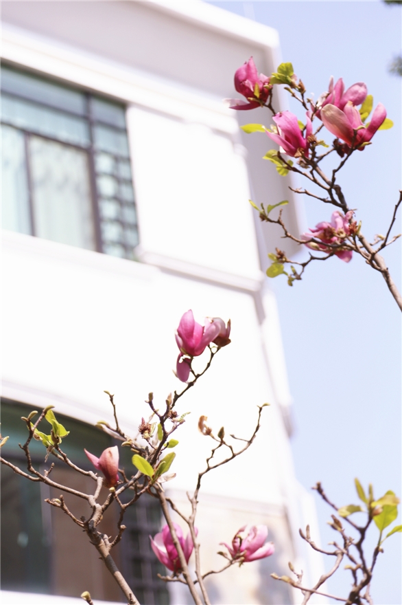 红玉兰爬上枝头,守护着这满园春色