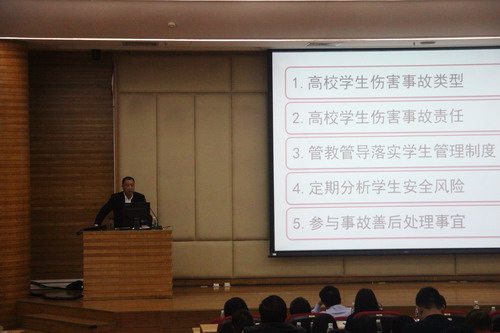 又讯 1月9日上午,为提升学工干部学生管理及应急事件处理能力,学生工作部(处)邀请法学院教授张永华就学生突发事件分析与应对进行专题讲座。张永华就高校学生伤害事故类型、事故责任、管教管导落实学生管理制度、定期分析学生安全风险及参与事故善后处理事宜为全体学工干部进行系统培训。