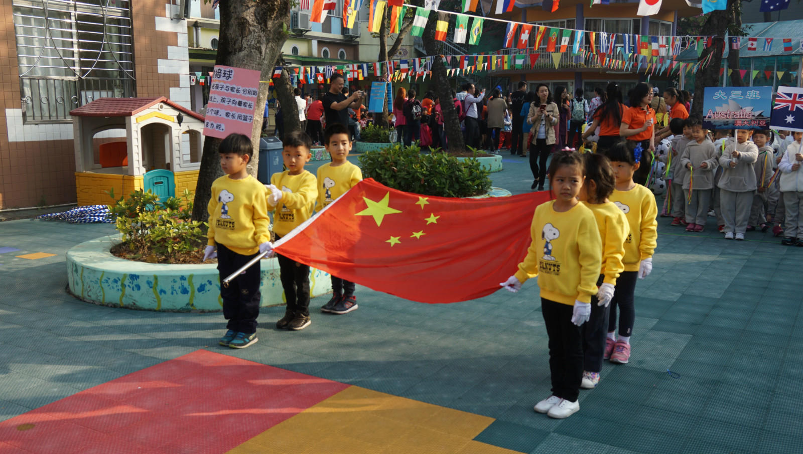 此次活动以国际文化体验为主题,采用个人项目竞技、亲子游戏形式,分三个年级组进行比赛。内容结合了各国的特色游戏,形式多样,集趣味性、参与性为一体。有活泼的“袋鼠跳”、奔忙的“滚轮胎”、忙碌的“拍皮球比赛”、精彩的“巴西独木桥”、需谨慎前行的“螃蟹夹球”等。运动场上,孩子们一展身手、家长们玩得不亦乐乎。班级间的拔河比赛为运动会推向高潮,选手们完全不顾忌汗水,齐心协力,在孩子和家长们呐喊助威声、鼓掌喝彩声和欢声笑语声中共享拔河带来的欢乐。