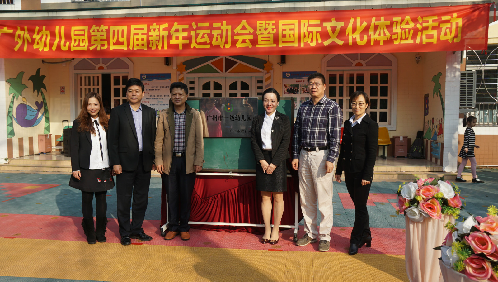 新市教育指导中心主任黄晓波、教育集团总经理孙建军、广外附属中小学校长吴玉爱、园长周宇、执行园长曾晓杰、副园长张惠芬共同揭开市一级牌匾。