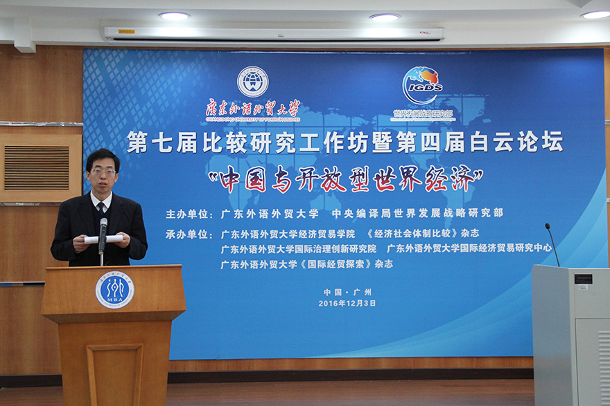 本网讯 为了更好地认识新常态下世界和中国经贸发展的新态势,分析后危机时代全球经贸的新动向,提出促进中国经贸平稳健康发展的对策推动中国经济的发展贡献智慧,12月3日,第七届比较研究工作坊暨第四届白云论坛“中国与开放型世界经济”学术研讨会在伟德bv国际体育北校区MBA楼丝纺讲堂举行。出席本次研讨会的有中国世界贸易研究会会长、原商务部副部长、我国驻WTO首任大使孙振宇,中央编译局副局长季正聚,国家外国专家局中国国际人才交流基金会主任苏光明、对外经济贸易大学副校长林桂军、中央编译局世界发展战略研究部副主任、《经济社会体制比较》杂志主编丁开杰、人民日报社《内部参考》主编辛本健,伟德bv国际体育党委常委、副校长何传添等。会议由伟德bv国际体育经济贸易学院院长张建武主持。