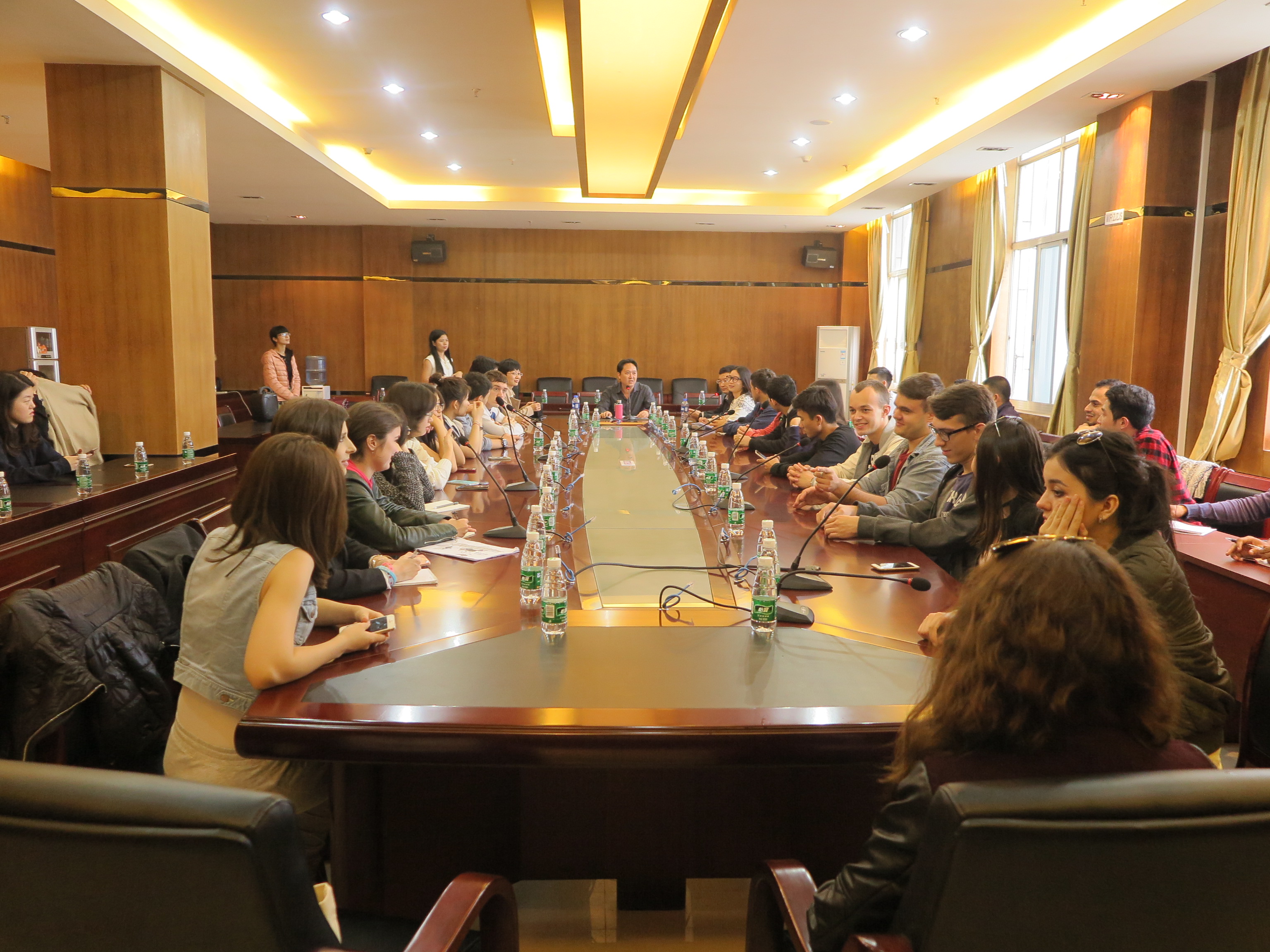 活动首站为湛江市水产协会,师生一行在会议厅进行了座谈会。湛江市水产协会秘书长岑坚详尽地介绍了湛江市的历史地理情况及经济发展现状,重点讲述了湛江市水产的地理优势、养殖规模、企业发展、水产品出口等情况。在自由提问环节上,留学生们纷纷发表了自己的看法和见解,大家畅所欲言,现场气氛十分活跃。
