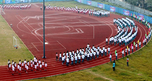 彭银祥、刘江南等为伟德bv国际体育肇庆外校足球队队员赠球,彭银祥宣布肇庆市学校阳光体育冬季长跑起跑,高新区局长邓继荣鸣开幕式枪。随着发令枪的响起,肇庆外校中小学2000名师生在活泼、喜悦、富有节奏感的音乐中按方队跑操入场,现场气势壮阔,呈现出运动的活力与激情。