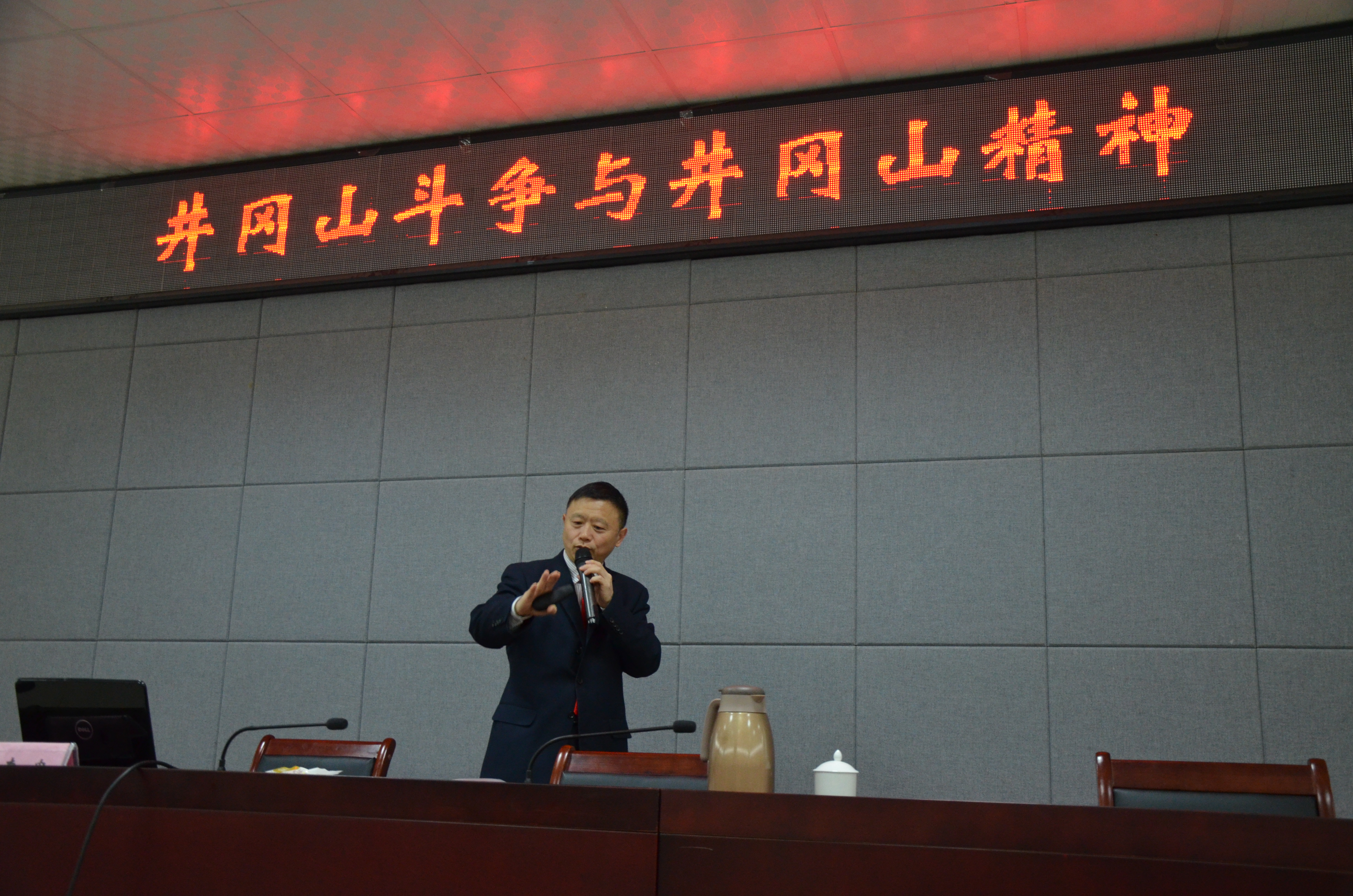 井冈山大学教授李忠就“井冈山斗争与井冈山精神”为青马班学员作了专题讲座。李忠从井冈山根据地的发展历程、井冈山斗争的历史经验、井冈山精神及其时代价值等方面为大家展开分析,并对井冈山精神的内涵作了深刻的总结:坚定执着追理想、实事求是创新路、依靠群众求胜利、艰苦奋斗攻难关。讲到动情处,他还唱起了“映山红”等歌曲,与学员进行互动。