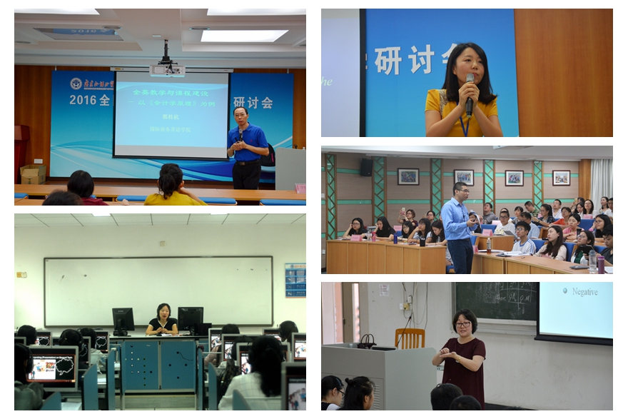 来自商英学院的5位优秀一线教师深入讲解商务英语专业的语言类课程和商务类课程教学的理念、设计与方法,并就上述课程进行示范课观摩与互动交流。商英学院院长郭桂杭以《会计学原理》精品资源共享课程说课与研讨为主要内容,围绕会计学课程教学开展讨论,从自身实际出发指导教师有关如何走向成功的课堂教学及如何处理国际化和国情的关系等问题。徐惠娟的公开课着重于微课制作,她介绍了新型的教学理念,并通过合作对译等课堂练习,展示了商务口译教学。康蕾的公开课与研讨都以组织行为学为主题。她以情感为出发点,详细介绍了相关理论以及情感与组织行为的关系和对此的影响,并结合中国传统文化和中国的相关研究进行拓展。王伟强展示的是经典的商务英语教学课程——综合商务英语,他从商务和综合英语两方面解释了此课程的特色和重要性,并引发老师对自己在这一课程中的角色的思考。王欣研讨的内容主要是教学课堂中思辨能力的培养,并提出这是现今教学中的重点,之后她带来了以国际商法为主题的公开课。