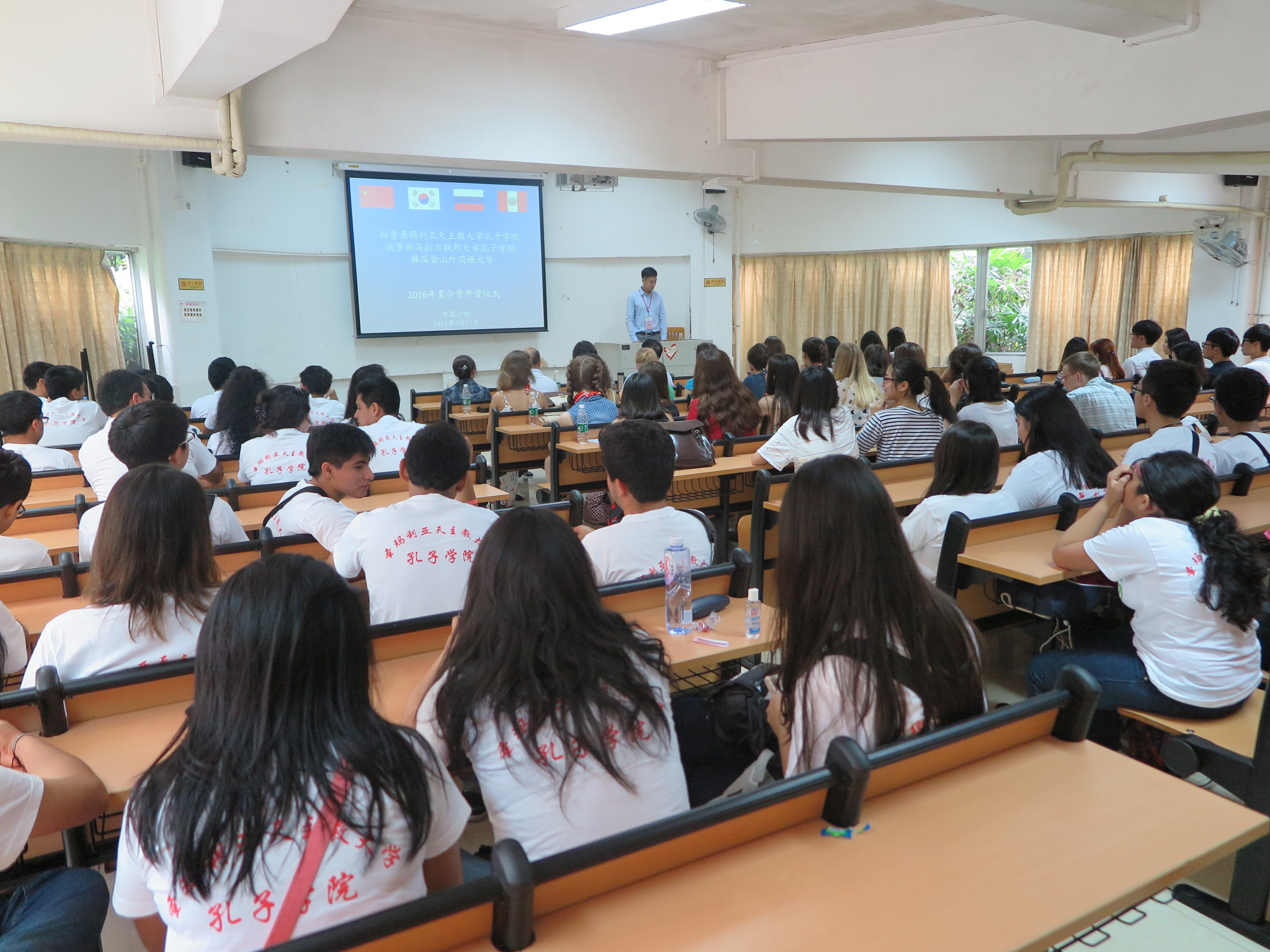 本网讯 7月10日,秘鲁圣玛利亚天主教大学孔子学院、俄罗斯乌拉尔联邦大学孔子学院及韩国釜山外国语大学2016暑期夏令营开营仪式在第七教学楼110教室举行。留学生教育学院院长梁学宏等学院领导、秘鲁圣玛利亚天主教大学孔子学院中方院长彭启贵、俄罗斯乌拉尔联邦大学孔子学院中方院长陈辉及64名俄罗斯、秘鲁及韩国学生出席了开营仪式。