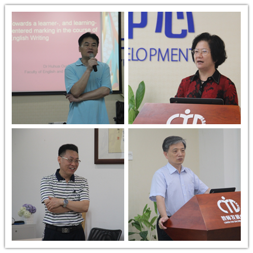 英文学院欧阳护华教授主讲的《如何实施学生学习中心的教学法改革——以写作课互评互改为例》开启了本研修班的学习之旅。该课程主要围绕“老师不改作业”这个话题展开,探讨现行教师批改作业的传统方式的弊端和问题,启发在场老师思考,引出来自西方教研成果的作业互评互改模式的介绍,细致讲解这种新的写作课教学法改革的优点和特色之处,给在场的中国外语教师带来了耳目一新的教学体验和策略,激发了他们改革教学模式的热情和动力。