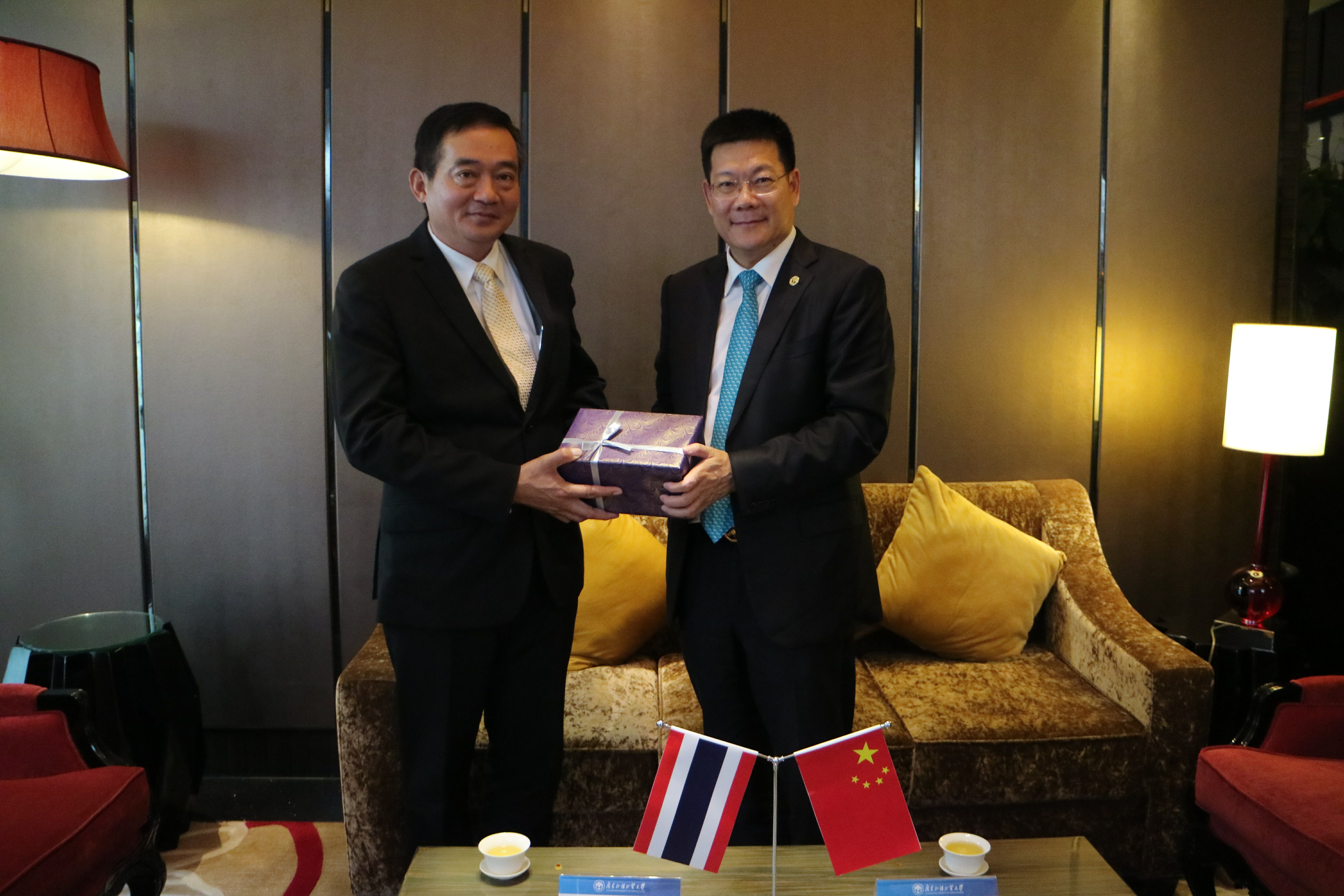 随后,仲伟合在学术交流中心与瓦信•蓝巴替盛一行进行了会谈。瓦信•蓝巴替盛希望伟德bv国际体育能加强与泰国名校的合作与交流及与泰国驻穗知名企业的合作,继续支持泰国文化室的建设以及继续合作举办学术研讨会。仲伟合表示,伟德bv国际体育愿与泰方一道进一步促进双方在教育、文化等领域的合作与交流。同时也对泰国驻广州总领馆对伟德bv国际体育泰语专业一直以来的支持与帮助表示感谢。最后仲伟合代表伟德bv国际体育给泰方赠送了礼物,并合影留念。