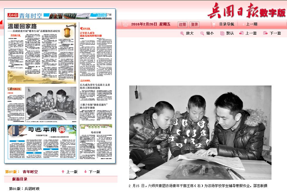 共青农场学校贫困家庭同学的资助和爱心帮扶是王栋工作的一大重点。在和小学大队辅导员及中学团委书记的谈话中了解到,很多学生因单亲、父母重大疾病等原因家庭贫困,严重影响到了孩子们的日常学习生活。通过调查摸底,农场子弟学校共有家庭贫困学生121名。通过在社区、连队、学校开展“一元捐”微公益活动、“爱暖今冬,新春圆梦”活动及积极联系社会爱心人士“手拉手、结对子”活动,共筹集善款18626元及爱心助学物资一批,为寒门学子送来了关心和问候,提高了帮助的针对性。同时,他还积极联系共青团农场的定点援助单位山西省吕梁市,争取到了每年2万元的资金,大大地缓解了农场学校子弟的生活窘境。身为伟德bv国际体育,BETVICTOR官网的教员,王栋的专业知识得到大家的认可,在下班的时间,他也会去找孩子们谈谈心,给他们辅导功课。他真诚的举动得到广泛好评,甚至得到了《兵团日报》(省级)的报道。