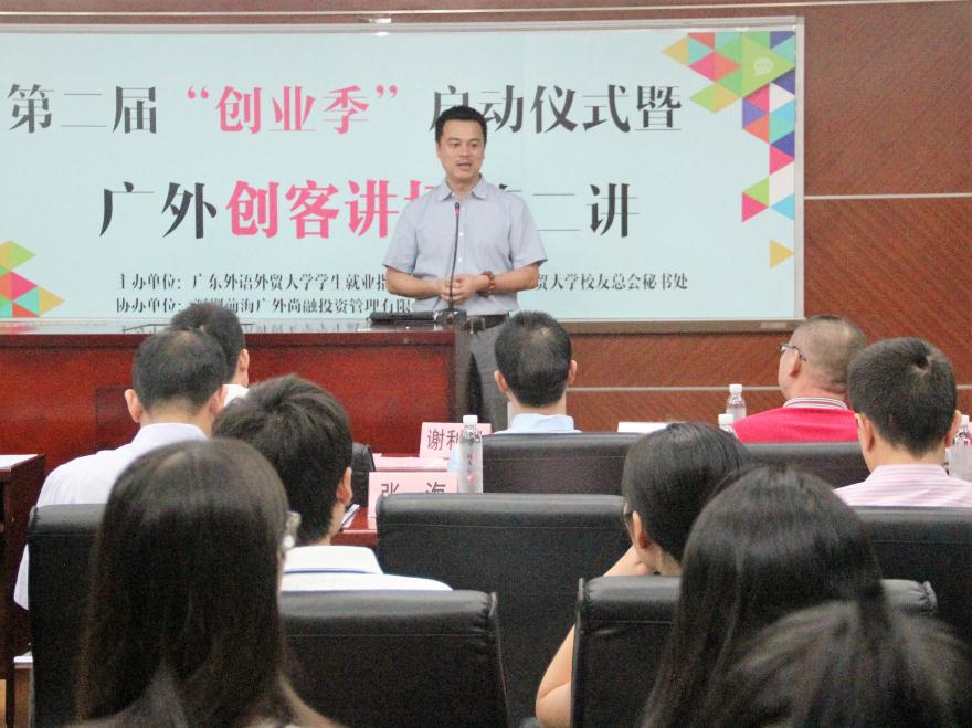 仪式过后的广外创客讲坛上,天使投资人、“网红网”创始人谢利明分享主题为“网红经济”的讲座。离开广外二十年,谢利明表示十分怀念校园。在泛娱乐时代中,他认为广外学子在创业方面有较大发展空间。通过列举同道大叔、王尼玛等网红为例,他认为随着新媒体的发展,网红将逐渐成为广告新的传播主体,而网红的变现能力也将不断增强。他告诉同学们:“扎根于小的领域可能会有更大的发展机会。当你深入了解学习相关和配套领域后,可以应用自己的感情色彩,去创造出自己的自媒体。”他还笑言:“如果创业没有什么方向,可以去当主播,成为网红。”最后,他建议同学们在“创业季”或“毕业季”中,去研究一些领域,并衷心祝愿同学们能在未来的领域有好的发展。