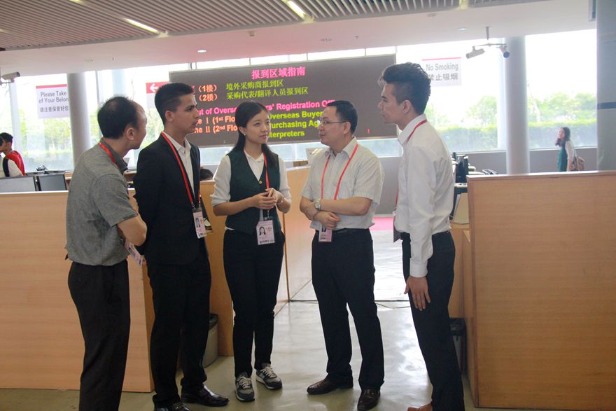 随后,刘海春一行在广交会相关部门负责人的陪同下参观了广交会发展史陈列室,并先后来到采购商办证中心、国际联络部VIP接待处、客商咨询服务台等工作岗位进行参观,亲切询问了实习学生的工作情况,还特别嘱咐同学们要劳逸结合,优质高效地完成任务。广外学子以其优良的服务态度、专业的服务质量、国际化的服务水平受到实习单位的高度肯定。
