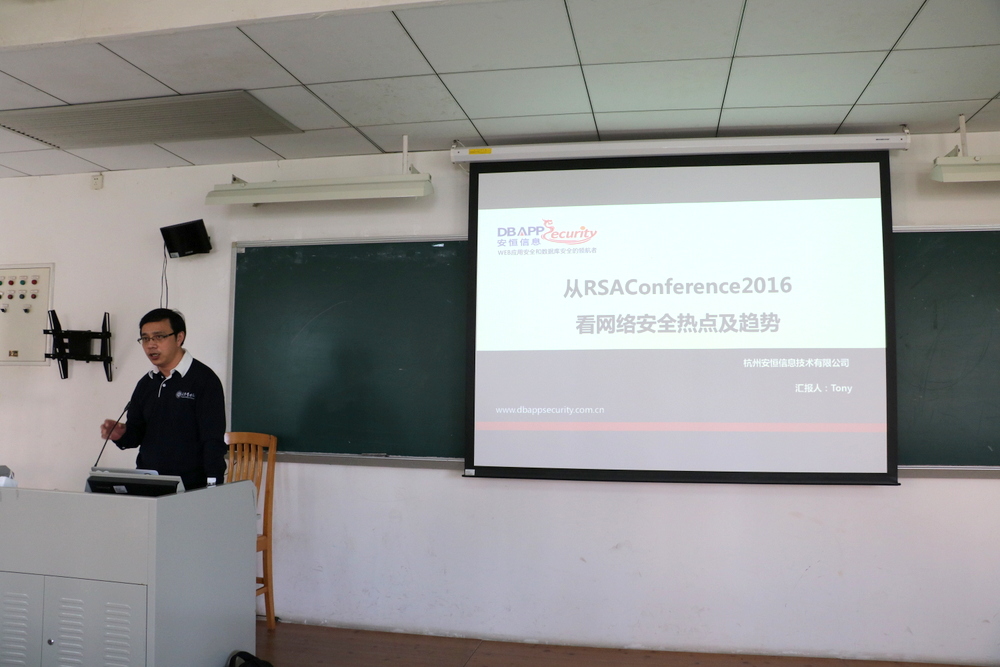 本网讯 4月7日下午,杭州安恒信息技术有限公司首席安全官、高级副总裁、浙江师范大学特聘教授刘志乐以“RSA Conference 2016”为背景,在南校区教学楼G206向学院全体师生阐述当下网络安全的相关情况。讲座结束后,副校长阳爱民为刘志乐颁发客座教授聘书,未来三年,他将参与指导信息学院的网络工程专业的实践教学与学生创新创业工作。
