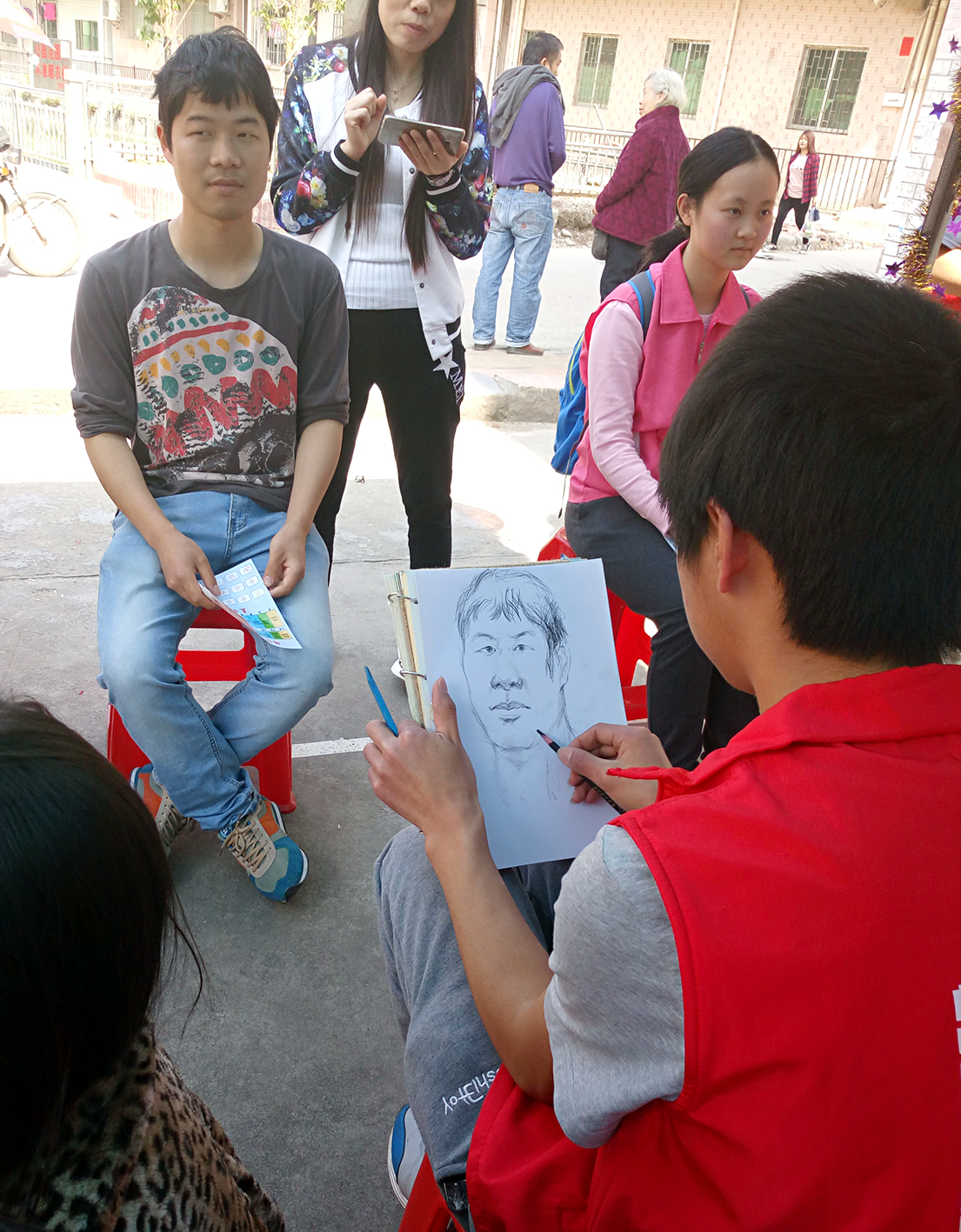 艺术学院提供的人物画像也吸引了不少街坊。街坊们排着长长的队伍等待艺术学院的同学们为自己画像,每个人的脸上都洋溢着笑容。
