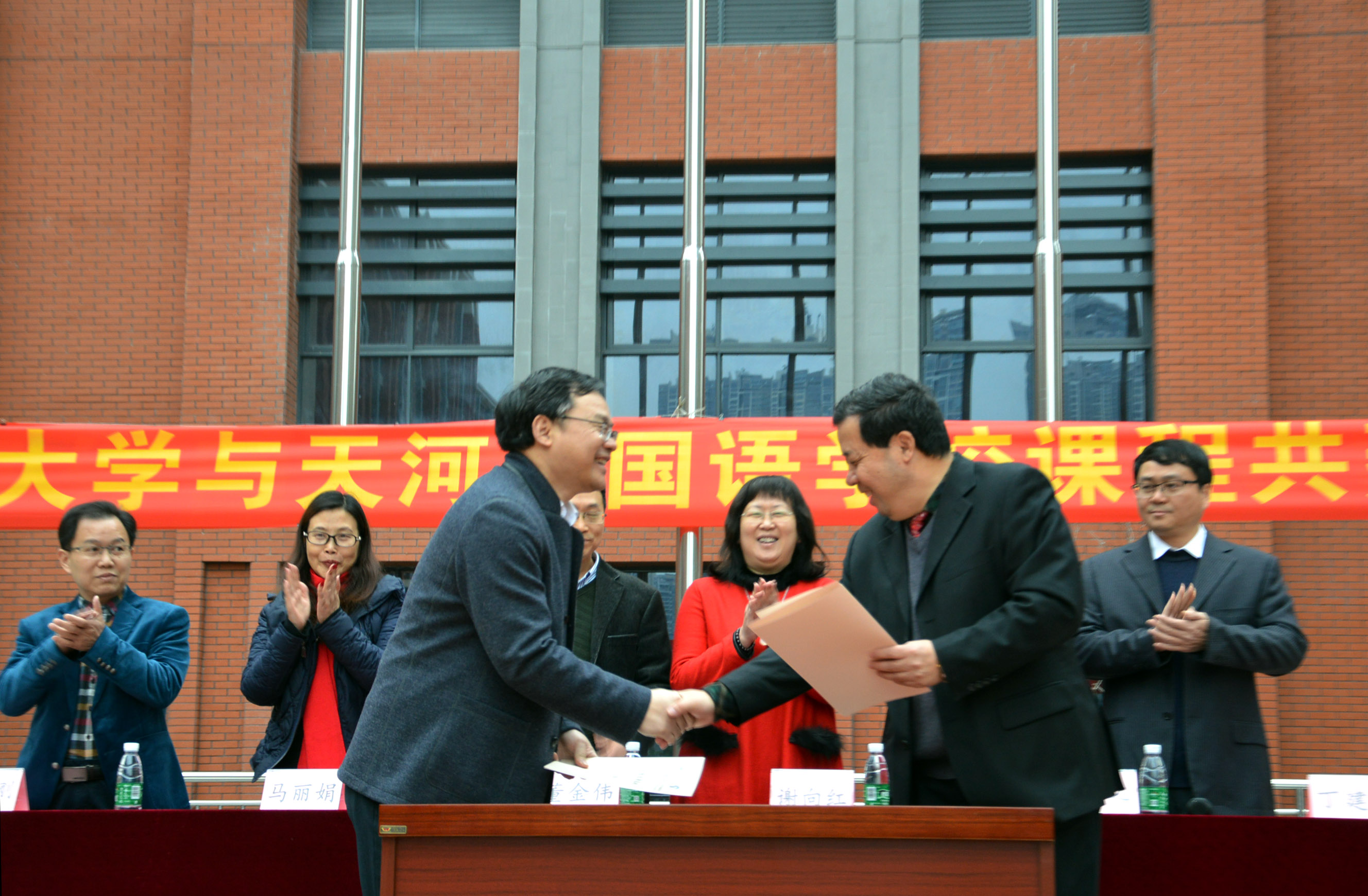 本网讯 2月21日下午,伟德bv国际体育与广州市天河外国语学校课程共建签约暨优质生源基地揭牌仪式在天河外国语学校举行。广州市天河区副区长丁建华、天河区教育局副局长谢向红、天河外国语学校校长崔海友和伟德bv国际体育副校长刘建达、招生办主任袁长青、英语教育学院院长董金伟等出席签约仪式。