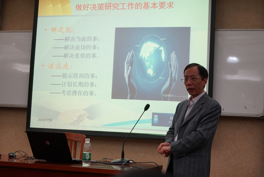 李惠武长期从事广东省政府政策研究,他从决策制定者角度就高校研究人员如何掌握国际形势、政府决策所需、决策咨询报告“基本技巧”做了系统阐述。研究人员首先需要了解政府关心的重点。政府解决问题的思维是:我能做什么而不是我需要做什么;我该怎么做而不是我都要做。决策咨询报告注重“三为”:为领导服务、为政府服务、为现实服务;聚焦“三点”:热点问题、重点问题、难点问题。做好决策研究的基本要求是:解近忧、谋远虑、热应对、冷思考。优秀的决策报告包括三个部分:想政府之所想、想政府之将想、想政府之未想。广东省政府面临中国经济进入新常态,面临速度换挡、结构调整、动力转化的大背景,“三期叠加”将贯穿十三五时期。围绕决策大背景,研究学者的决策咨询报告要抓住广东省重点关注事项、了解了国际形势发展,把握好选题 的“科学路径”。决策研究的“看家本领”包括三点:事业心、责任心是根本前提;世界眼光、决策思维是时代要求;深入调研、心中有数是见识基础。决策研究要保持“三心”,保有“三力”。