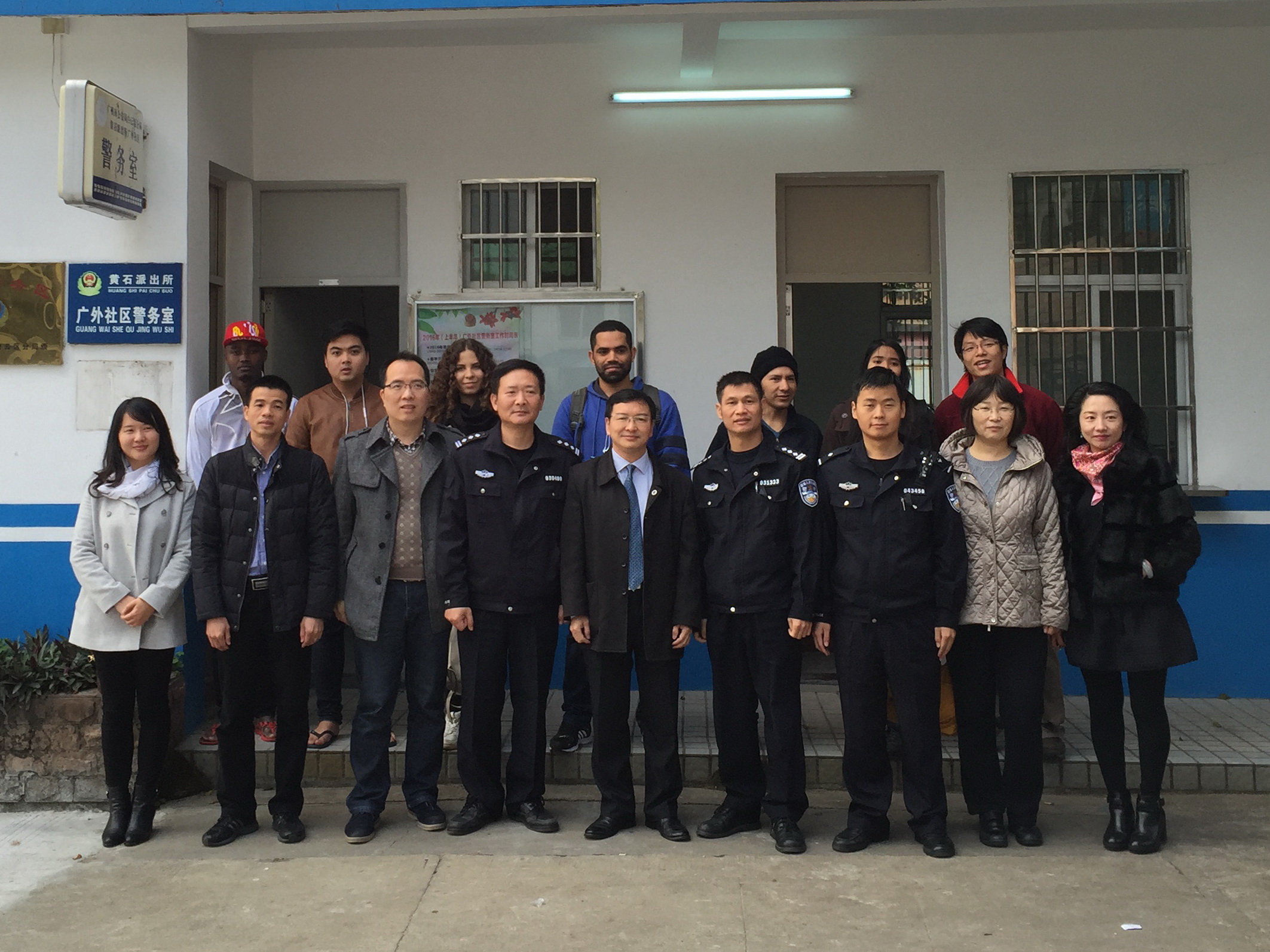 本网讯 为了帮助伟德bv国际体育外国留学生更安全快捷地完成临时住宿登记工作,校保卫处、留学生教育学院及黄石街派出所三方通力合作,经过三个月的统筹协调,1月13日上午,黄石街派出所广外社区警务室(以下简称“警务室”)在第一饭堂旁正式启用。保卫处处长何越晖,留学生教育学院院长梁学宏、副院长王凤兰、吴艳,黄石派出所所长邹毅山、副所长曹卫平等出席了启用仪式。到场的还有来自俄罗斯、秘鲁、印度尼西亚、多哥和埃及的留学生。