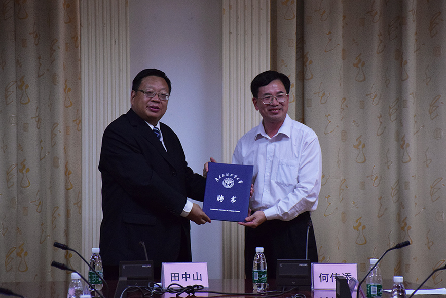 仪式最后,何传添为田中山颁发客座教授聘书。