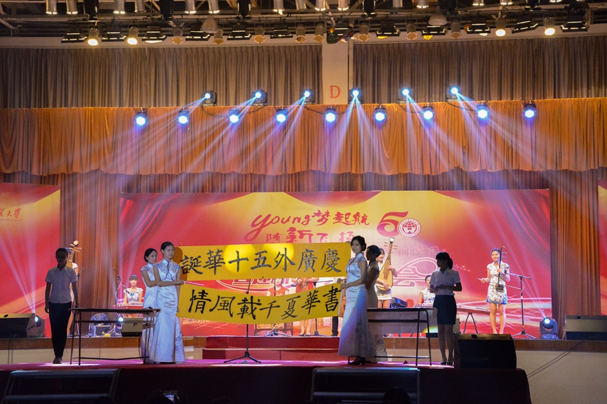 “庆广外五十华诞,书广外千载风情。”一幅对联,道尽的是莘莘学子对母校的祝福。带有中国风情的书法,配上器乐演奏,弹奏出美妙动人的古典乐,也印证了广外“学贯中西、明德尚行”的校训。一曲《Newage 新声》,轻轻诉说着这些歌者的故事,恬静淡雅。
